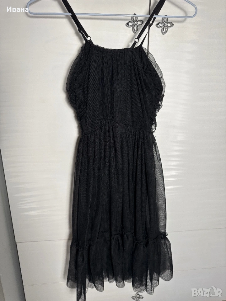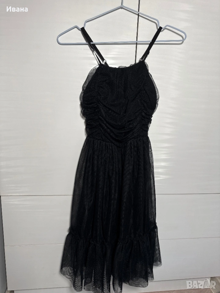 Черна рокля с тънки презрамки, обличана само веднъж. Моделът е с вградени подплънки в областта на бюста за по-добра форма и комфорт. В кръста е набрана, което придава леко стягане и красиво подчертава талията.
