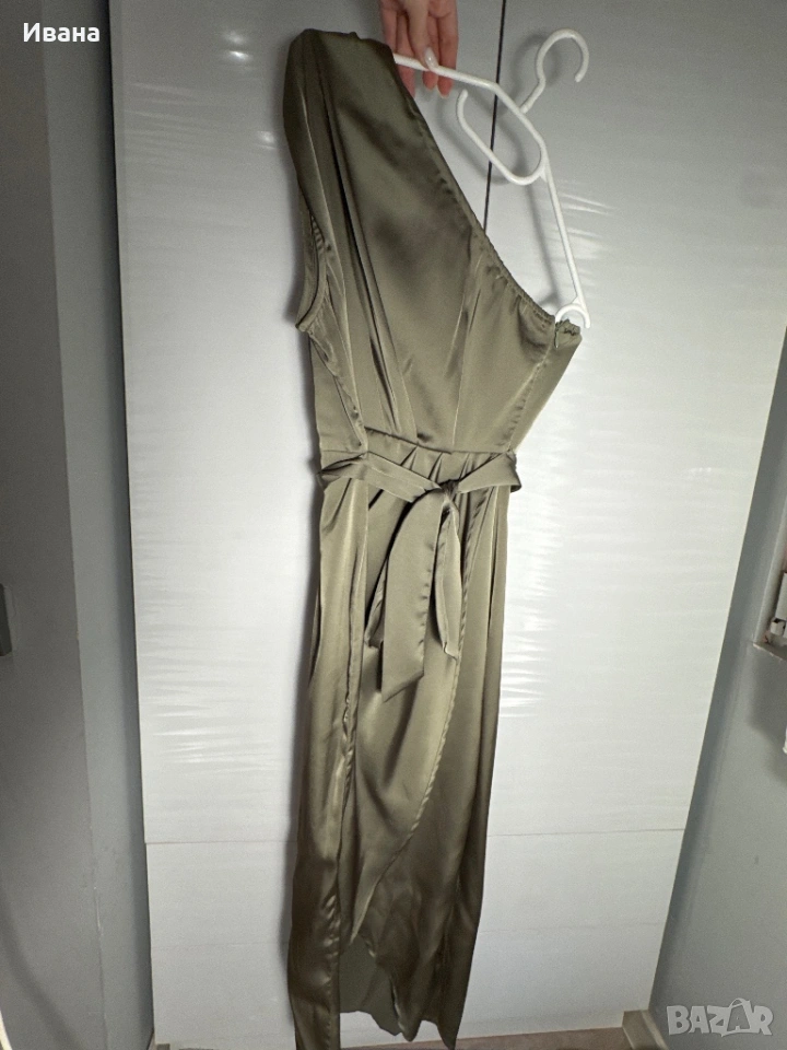 Официална зелена рокля с едно рамо и колан, който прибира талията и я подчертава. Роклята е с по-ярък цвят, не какъвто излиза на снимката