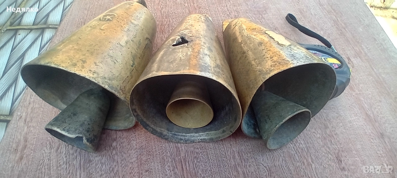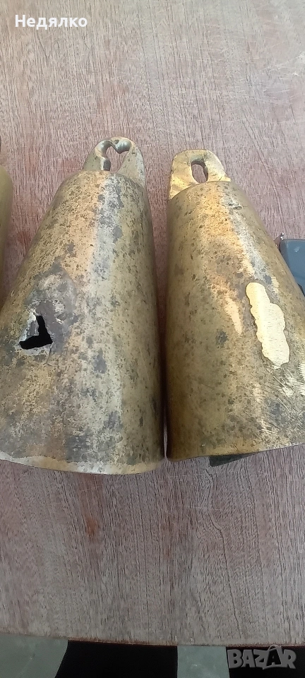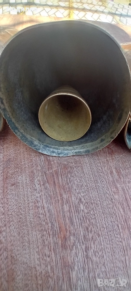 Автентичен, 12 см от ръб до ръб,10 см отвор в основата,чудесен звън,няма спукано и запояване,има на 2 места леки напуквания, от напрежението при отливката са получени. Към него добавям още 2,цена за трите,единия също е 12 см,другия е 11,5,лепени, единия в по-ранни времена,другият по-късно,но имат автентичен хубав звън,както съм ги купил.