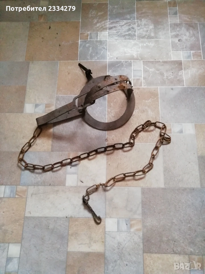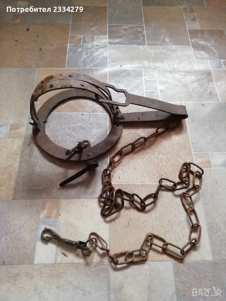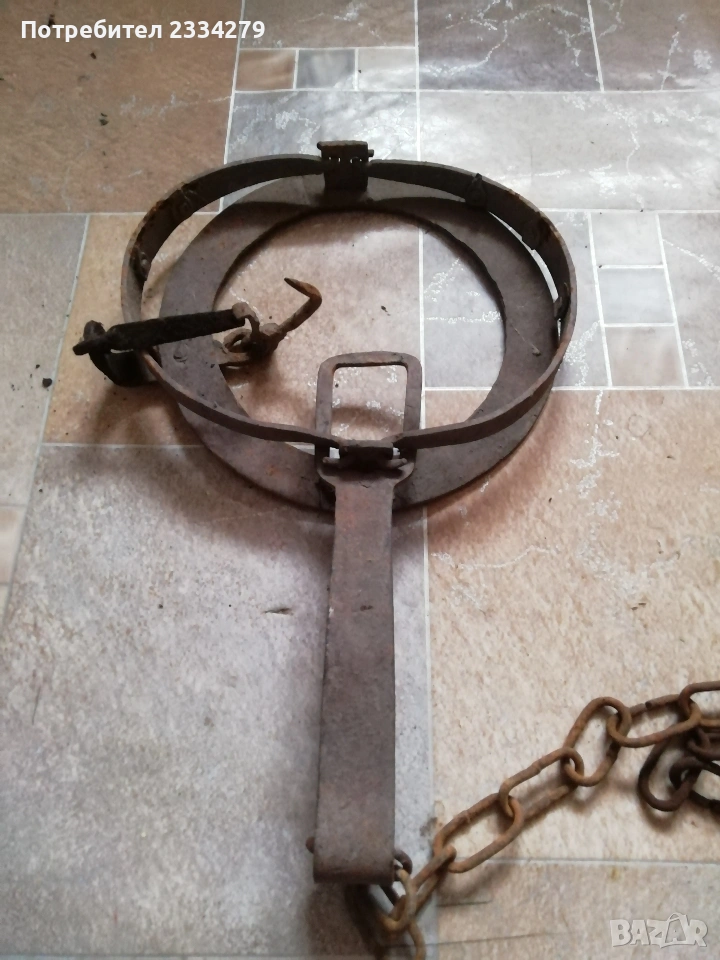 Стар 100% автентичен вълчи капан, ръчно изкован със силна прожина и челюсти със зъби, стара изработка на майстор ковач от 30-40те години, запазен работещ с вирига за закачане, размери 40х23см. Подходящ и за декорация на битова къща, двор, ловен кът, хижа, механа.