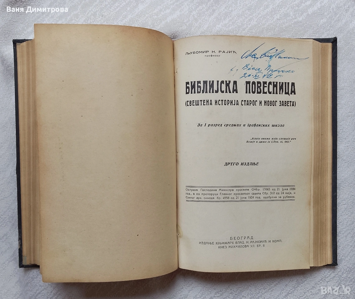 „Библейска повестница (Свещена история на Стария и Новия завет)“ За I разред средњих и грађанских школа Љубомир Н. Рајић, Београд 1934 г., второ издание