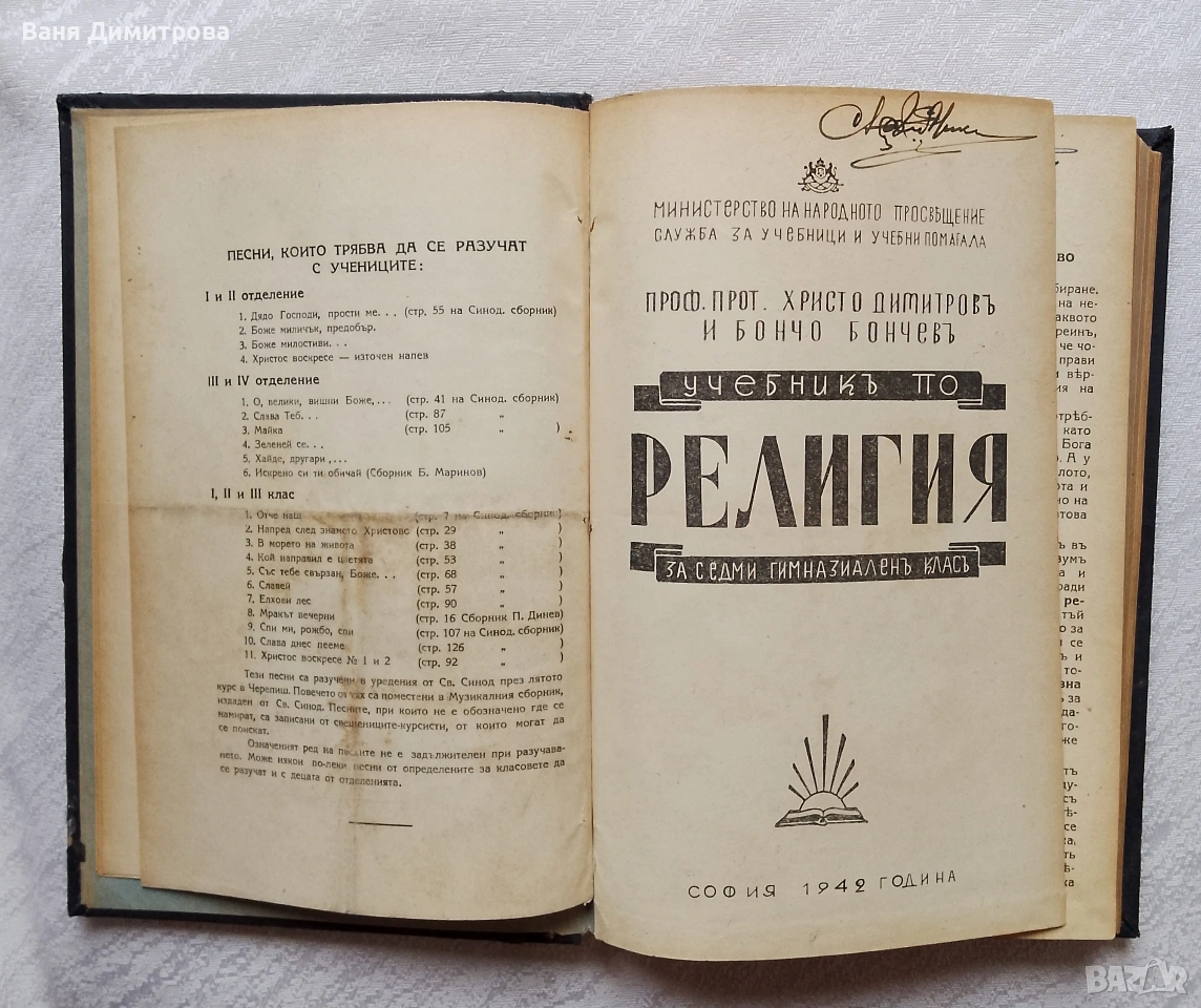 „Учебник по религия за седми гимназиален клас“ Проф. прот. Христо Димитров и Бончо Бончев, София, 1942 г.
