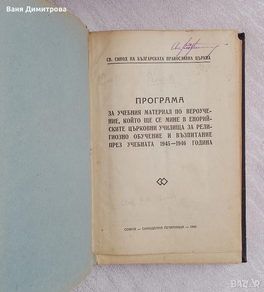 „Програма за учебния материал по вероучение…“ Издание на Св. Синод на Българската православна църква, София, Синодална печатница, 1945 г.