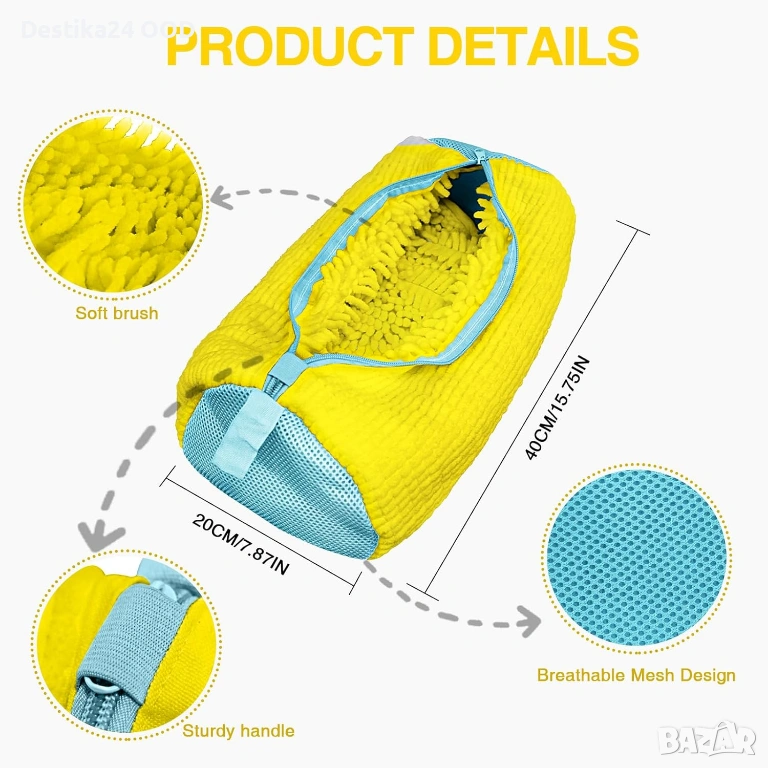 Плюшена чанта за пране на обувки в пералня. Жълта с цип.