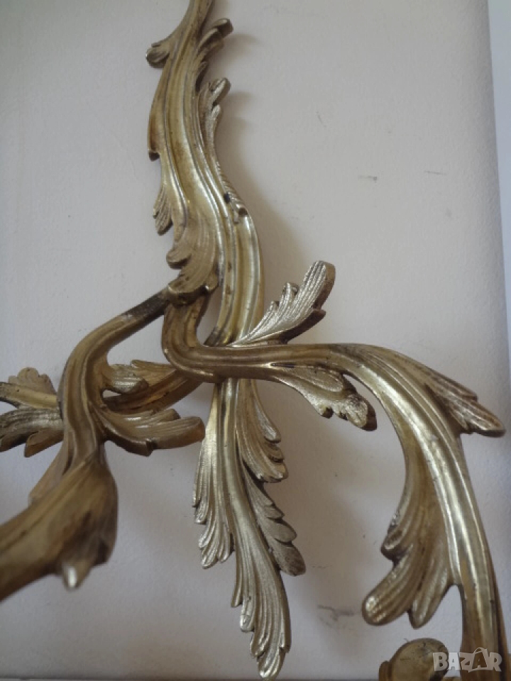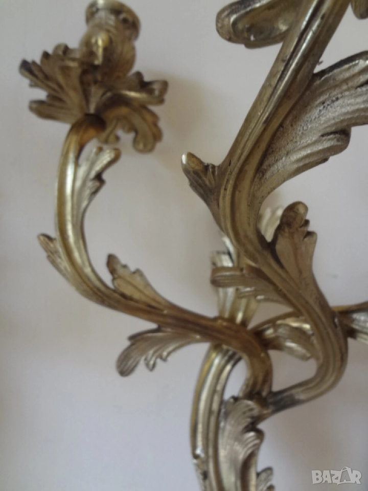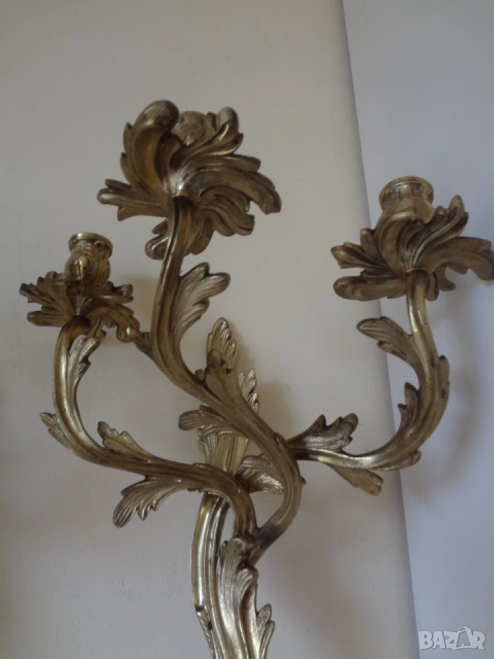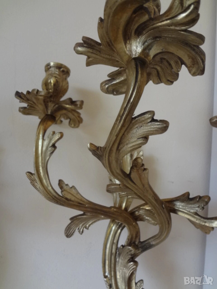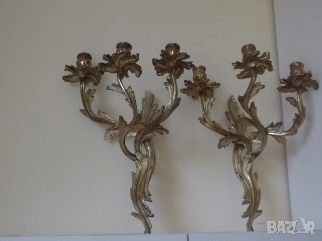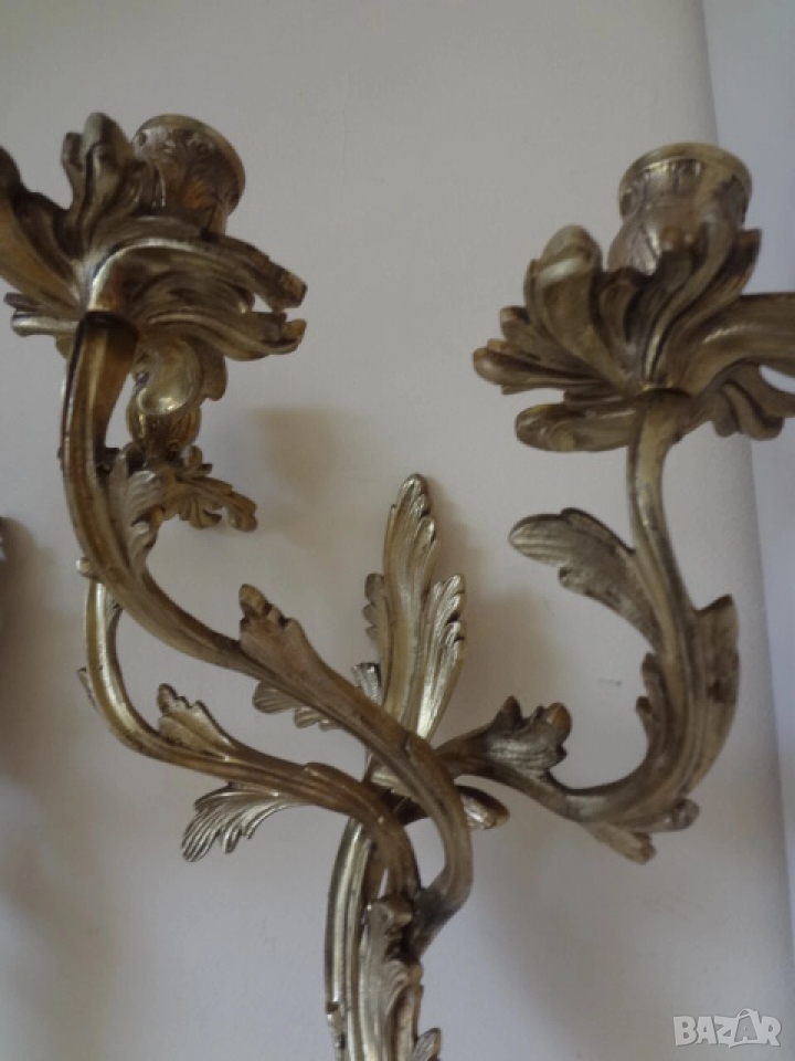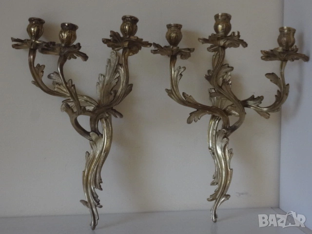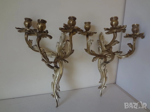 Комплект от 2 бр. големи разкошни бронзови свещника в идеално състояние от Виена. Невероятна изящна и ювелирна изработка на орнаментите във флорални мотиви изобразяващи цветя със стебла, листа и цветове. Тези масивни и невероятно красиви барокови свещници изглеждат величествено и в съчетание с тематични картини и огледала ще придадат един изискан и неповторим стил на дома. Подходящи са за по-класически тип на обзавеждане и поставянето им в коридора, спалнята или в хола около камината. Размери на всеки един - височина - 40 см.; ширина - 32 см.