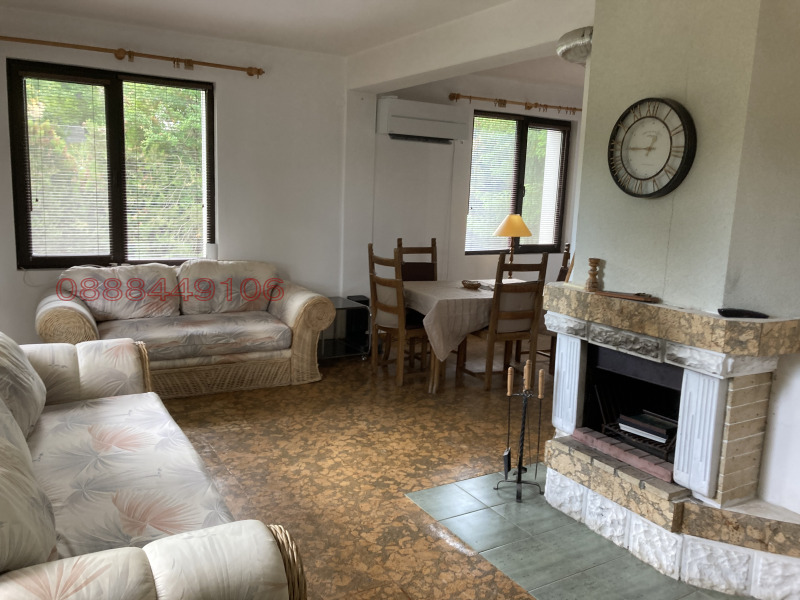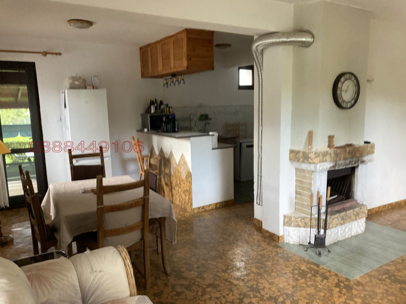 -Просторен хол с трапезария,кухненски бокс ,2 тераси и покрита веранда.Подовото покритие е корк а плотовете са от мрамор.Камината е с въздушна риза,която отоплява и двете спални разположени над хола.