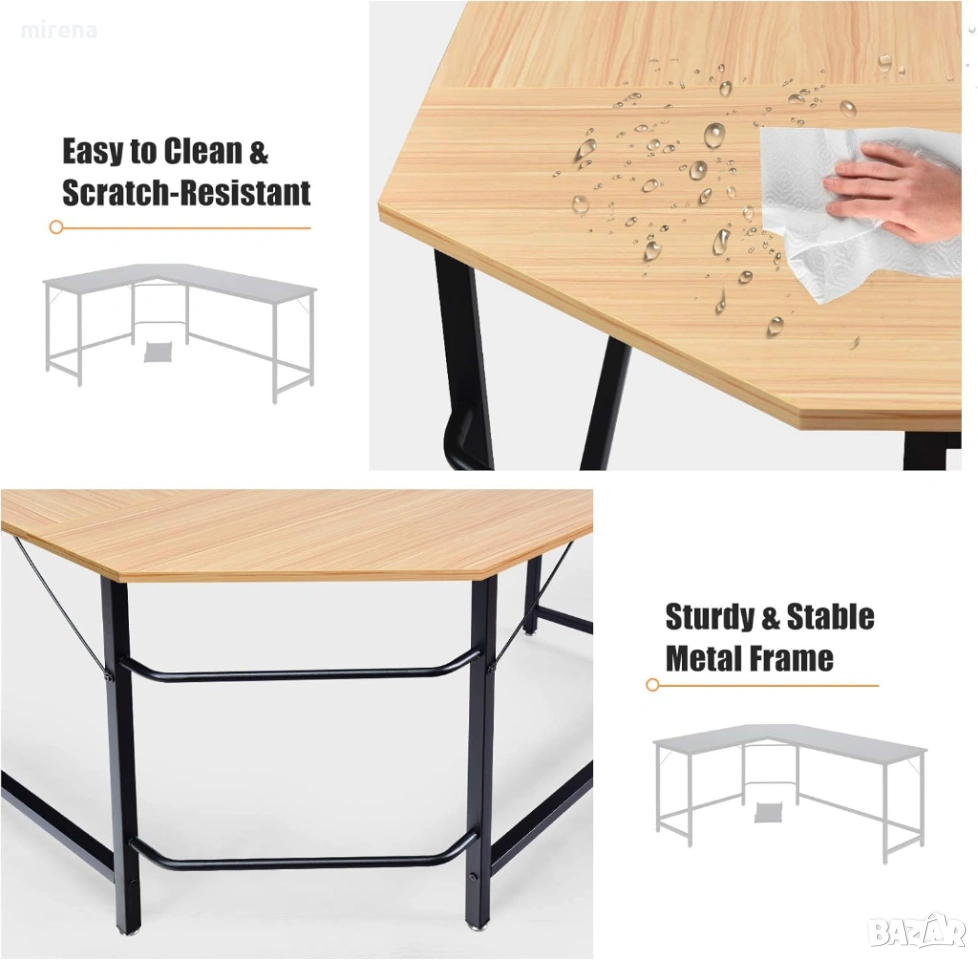Удобен монтаж и почистване След подробните и ясни инструкции за монтаж (английски език не е гарантиран), вие и вашето семейство сглобявате красива ъглова маса. Благодарение на водоустойчивата повърхност на плота и основата на масата, можете да избършете ъгловата маса с влажна кърпа.