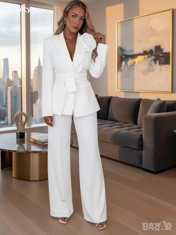 Дамски елегантен бял костюм сако с панталон с роза → Обява 53527714
