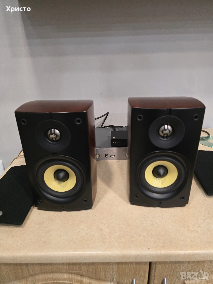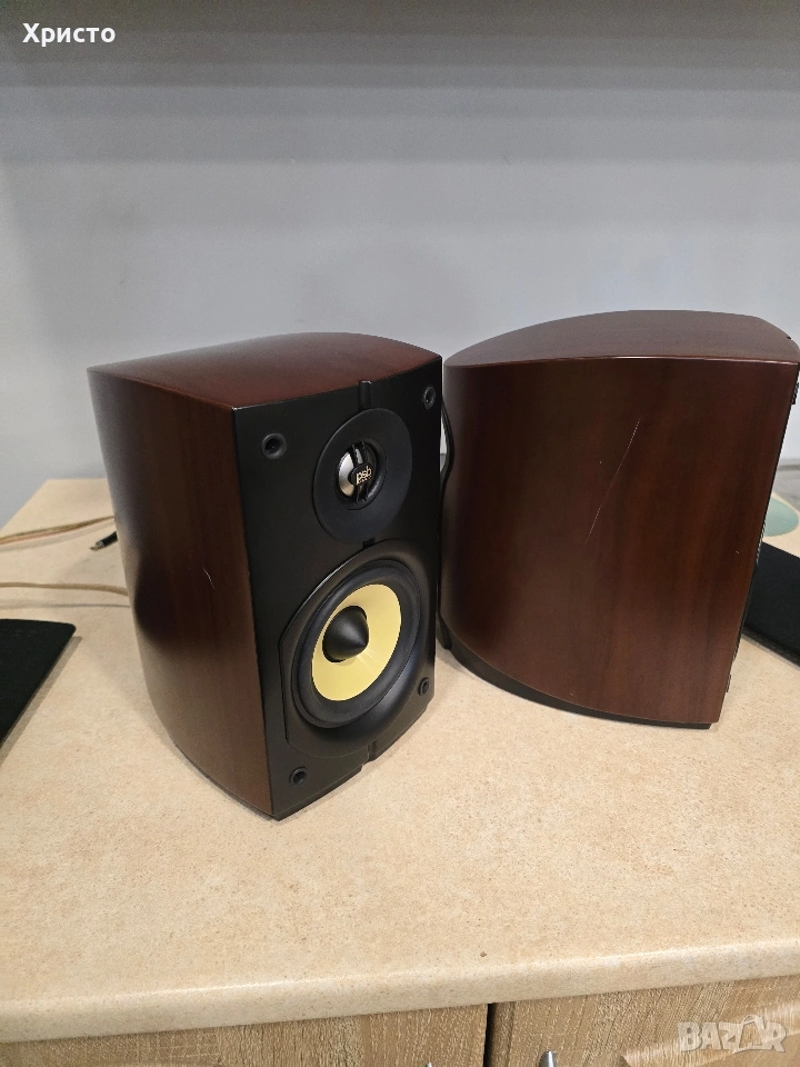 Продавам чифт компактни тонколони PSB Imagine Mini в красив естествен фурнир (тъмно дърво/орех). Този модел е известен сред аудиофилите с невероятно мащабния си звук, който опровергава физическите му размери.