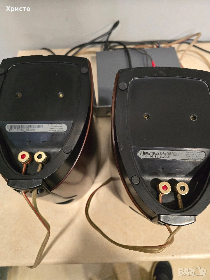 Визуално състояние: Имат козметични забележки по кабинетите (кутиите), които са съобразени с цената. По високочестотните говорители (пищялките) има съвсем дребни, почти незабележими следи, които по никакъв начин не влияят на качеството на звука и линейността на системата.