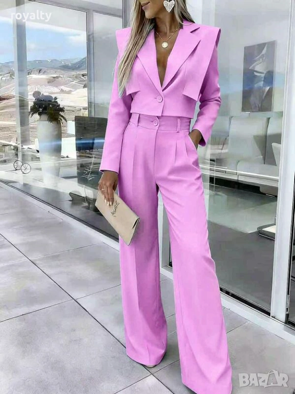 Елегантен розов костюм късо сако с панталон → Обява 53527831