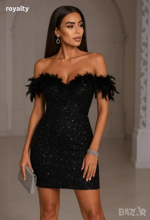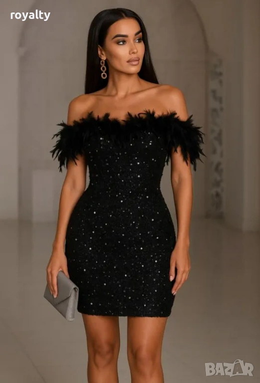 Къса парти рокля в черно от пайети с пера → Обява 53528149
