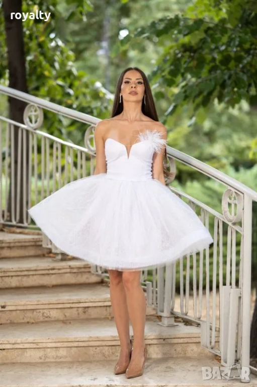 Къса бяла разкроена рокля с блясък и пера → Обява 53528211