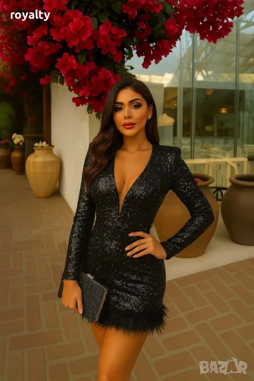 Къса черна рокля от пайети с дълги ръкави и пера → Обява 53528274