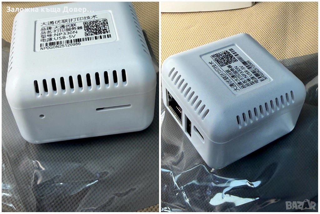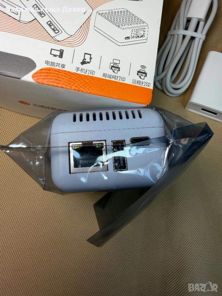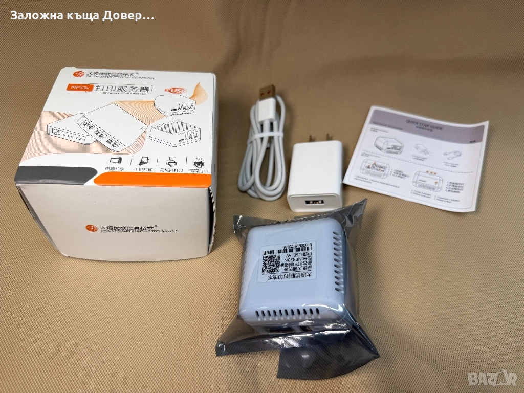 Print serwer network Пълен комплект с USB кабел,захранване и книжка.Ако принтера ви не е мрежов,може да направите така,че да разпечатва от няколко компютъра и телефон.Не е задължително да печата само от един компютър в офиса,а всички устройства,коиъо са в мрежата могат да печатат с един принтер.Съвместим с всички версии на windows и всякакви компютри и устройства.