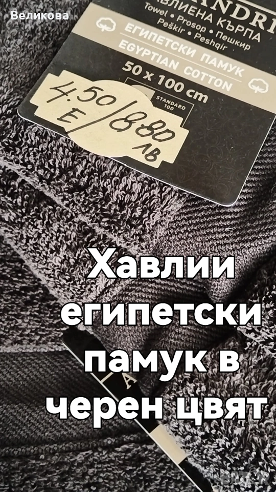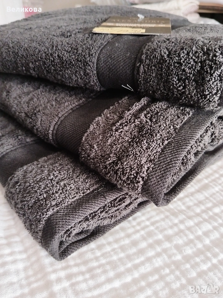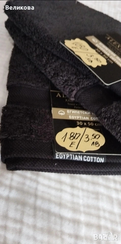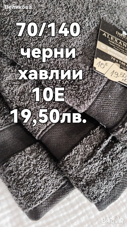 Хавлии от египетски памук в стилен черен цвят. 70/140 е с цена 10€. има и пп малки размер. Цени ще откриете върху снимките. Заповядайте.