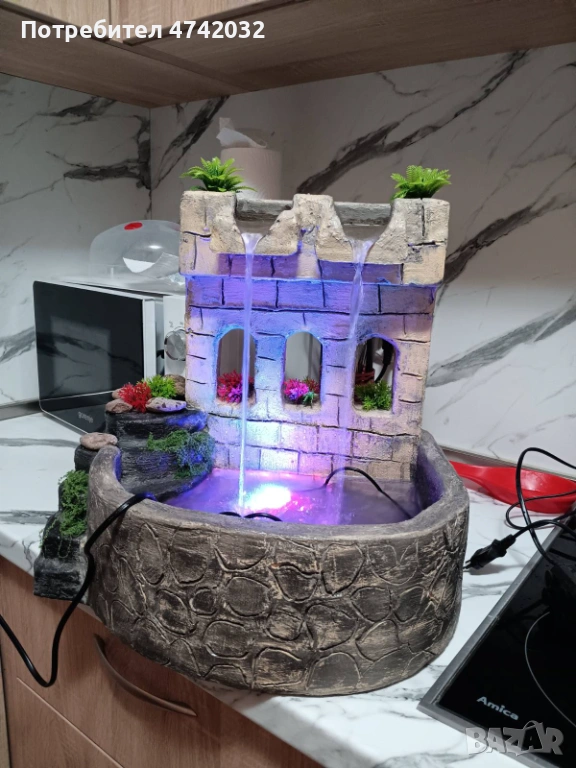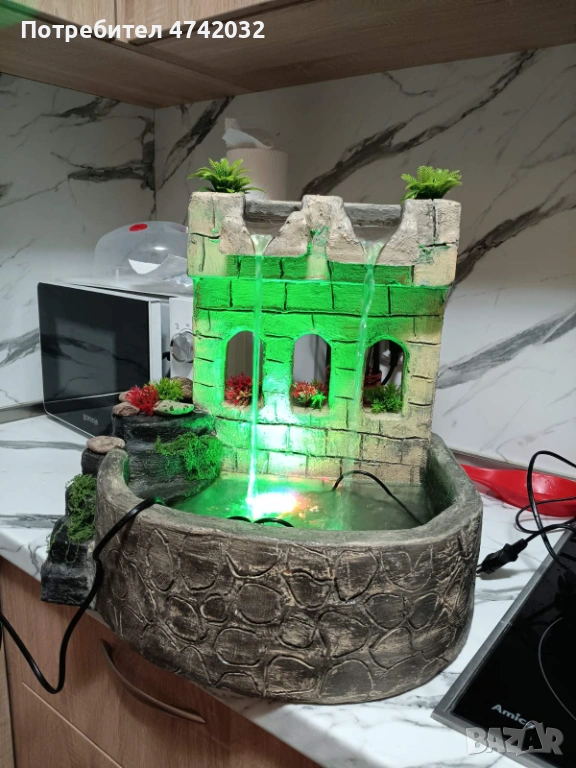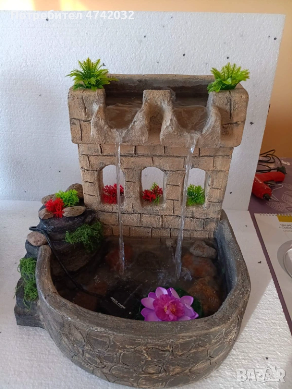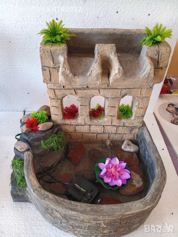 Красив ръчно изработен декоративен щадраван, изработен да имитира камък и украсен с растения. Фонтанът има две водни струи и добавя приятна атмосфера към всяко пространство. Подходящ за дома или градината, той ще внесе свежест и хармония. Размери 30х35х40см