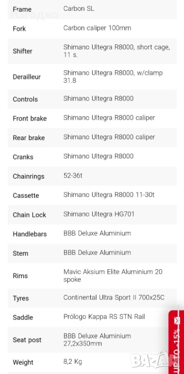 - Groupset / Групсет Shumano Ultegra - команди 2Х11 и спирачки Shimano Ultegra;