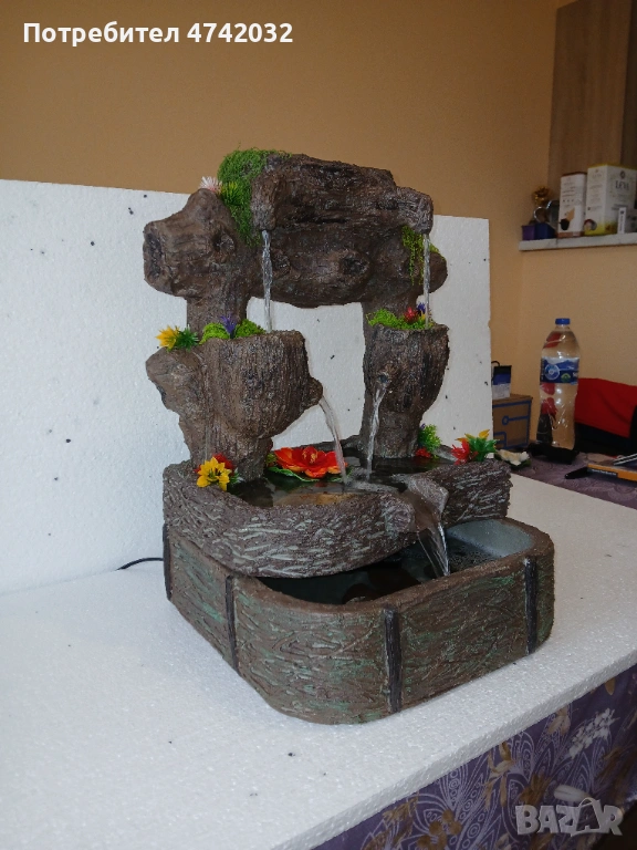 Помпата е изключително тиха – чува се единствено приятният ромон на водата. Изработени по технология с цимент и стиропор. Това ги прави достатъчно масивни и здрави, но не прекалено тежки за преместване. Тегло: Около 3-5 кг (стоят стабилно на мястото си). Размери: ~40 см (височина) х 35 см х 35 см. Някои модели имат и ефектно осветление към помпата. Могат да се ползват на открито и закрито (изисква се само достъп до електричество).