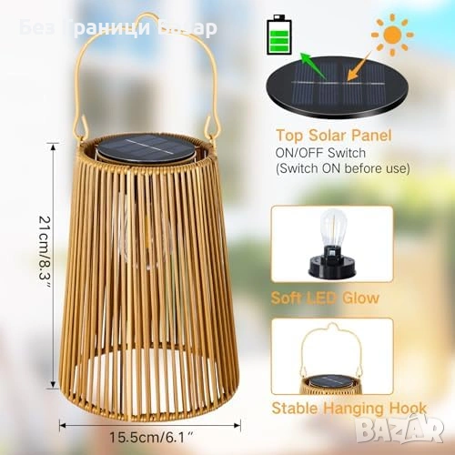 Зареждане 6–8 ч. на слънце, работа до 8–10 ч. с топла LED светлина