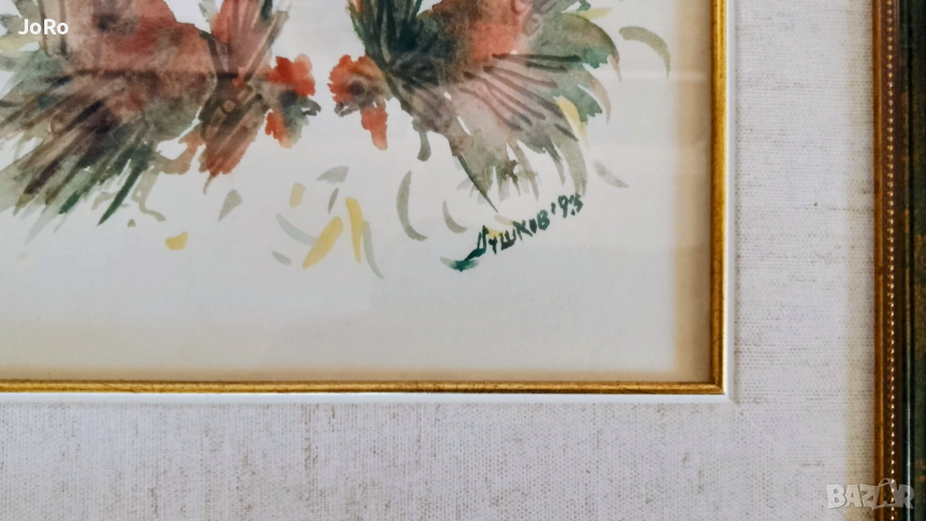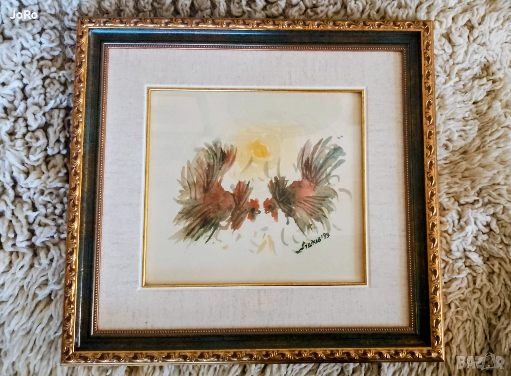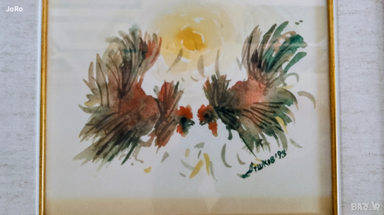 Продавам страхотен акварел от Благоевградския художник Методи Душков -"Петльов бой". Рамкиран в италианска дървена рамка и музейно стъкло. Размер с рамката и паспарту 35х33 см.