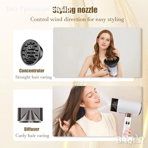 Нов Сешоар 2400W с йони 3 температури 2 скорости дифузер накрайник за коса