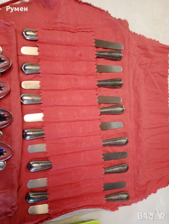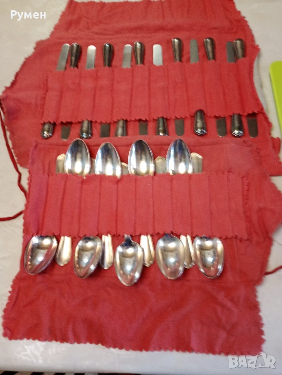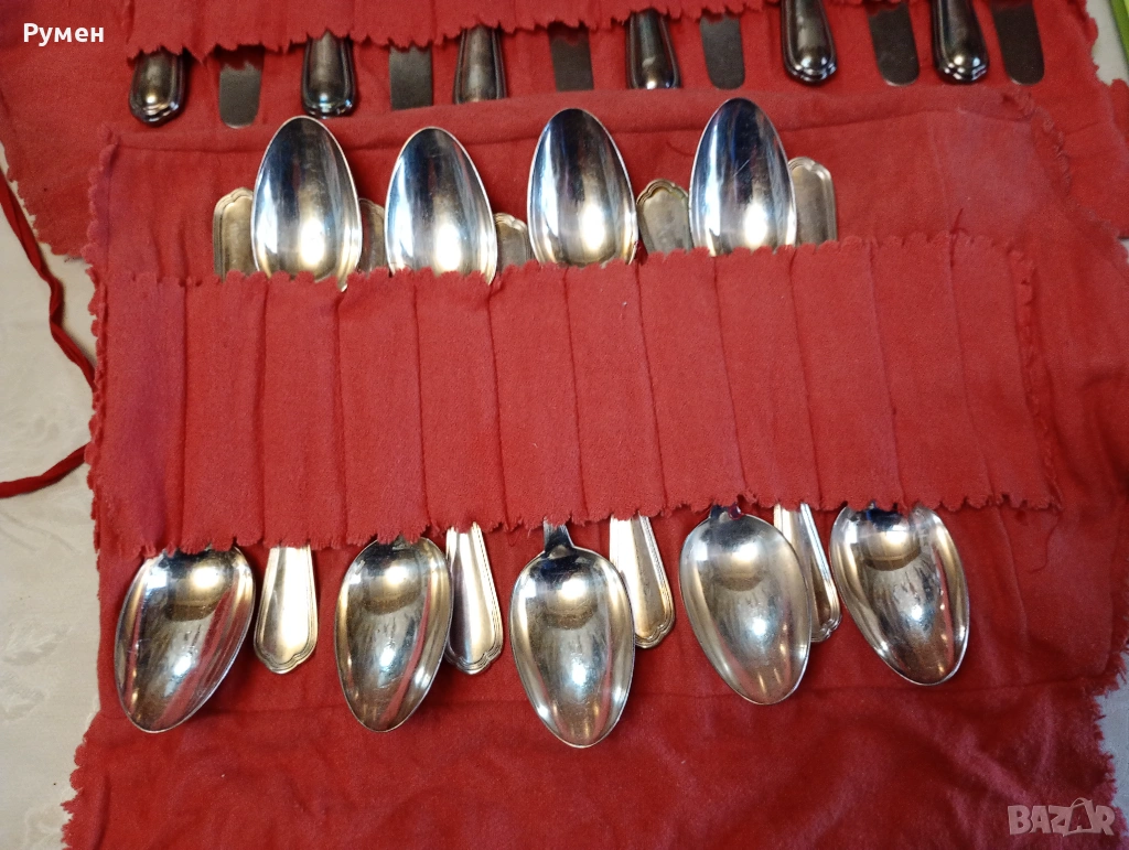 Пълен комплект от 12 ножа с тегло: 710 грама и непълен комплект от 8 лъжици с тегло: 430 грама.