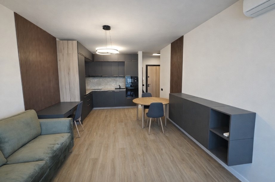 Имотът е обзаведен, с площ 65 кв.м, на 3-ти от 14 етажа в сграда с асансьор. Разпределението включва входно антре, дневна с кухня и трапезария, баня с тоалетна и тераса.