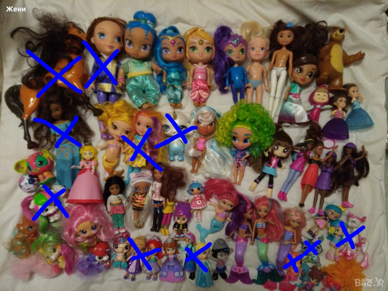 Играчките са оригинални (Mattel, Jakks, Hasbro и др.), повечето в отлично състояние, останалите в много добро. Цената на всяка ще се определи индивидуално, след справка в БГ магазините и в Ибей и намаляване от тамошната цена. Предполагам от 2 до 7€ за брой. За няколко отстъпка.