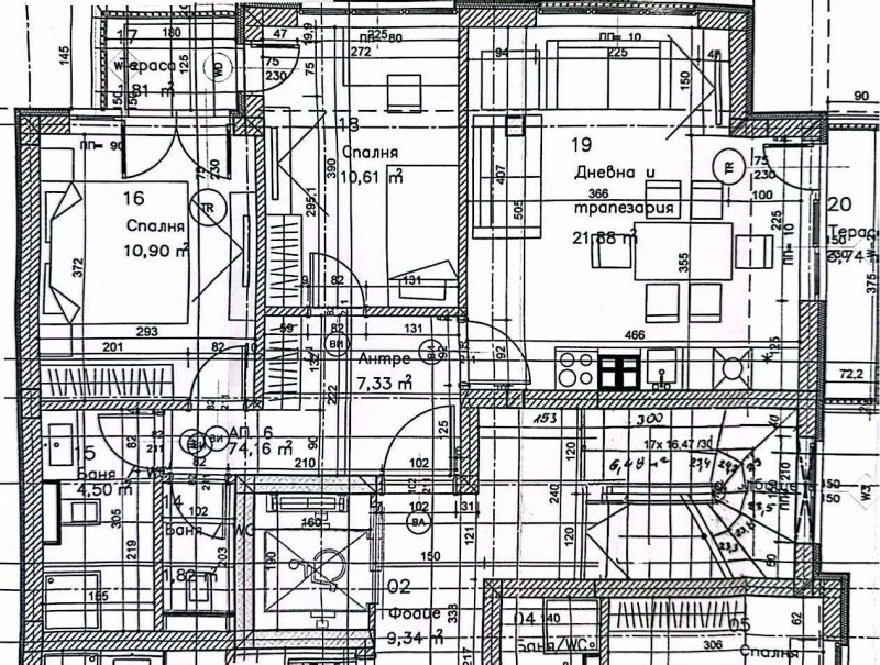 РАЗПРЕДЕЛЕНИЕ: Дневна с кухненски бокс, две спални, баня с тоалетна, просторно входно антре, две тераси и избено помещение.