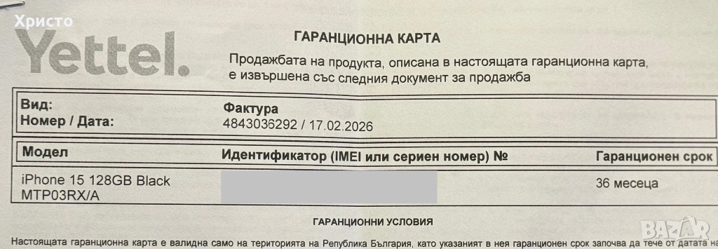Продавам Apple iPhone 15 в чисто ново, неразпечатано състояние. Устройството е закупено на 17 Февруари 2026 година и е с пълна 36-месечна гаранция. Телефонът никога не е активиран и не е използван. Работи с всички оператори. Продава се в комплект с подарък оригинален адаптер на Apple, за да бъде всичко напълно готово за употреба. Отличен избор за човек, който търси нов апарат без компромиси. Без бартери!