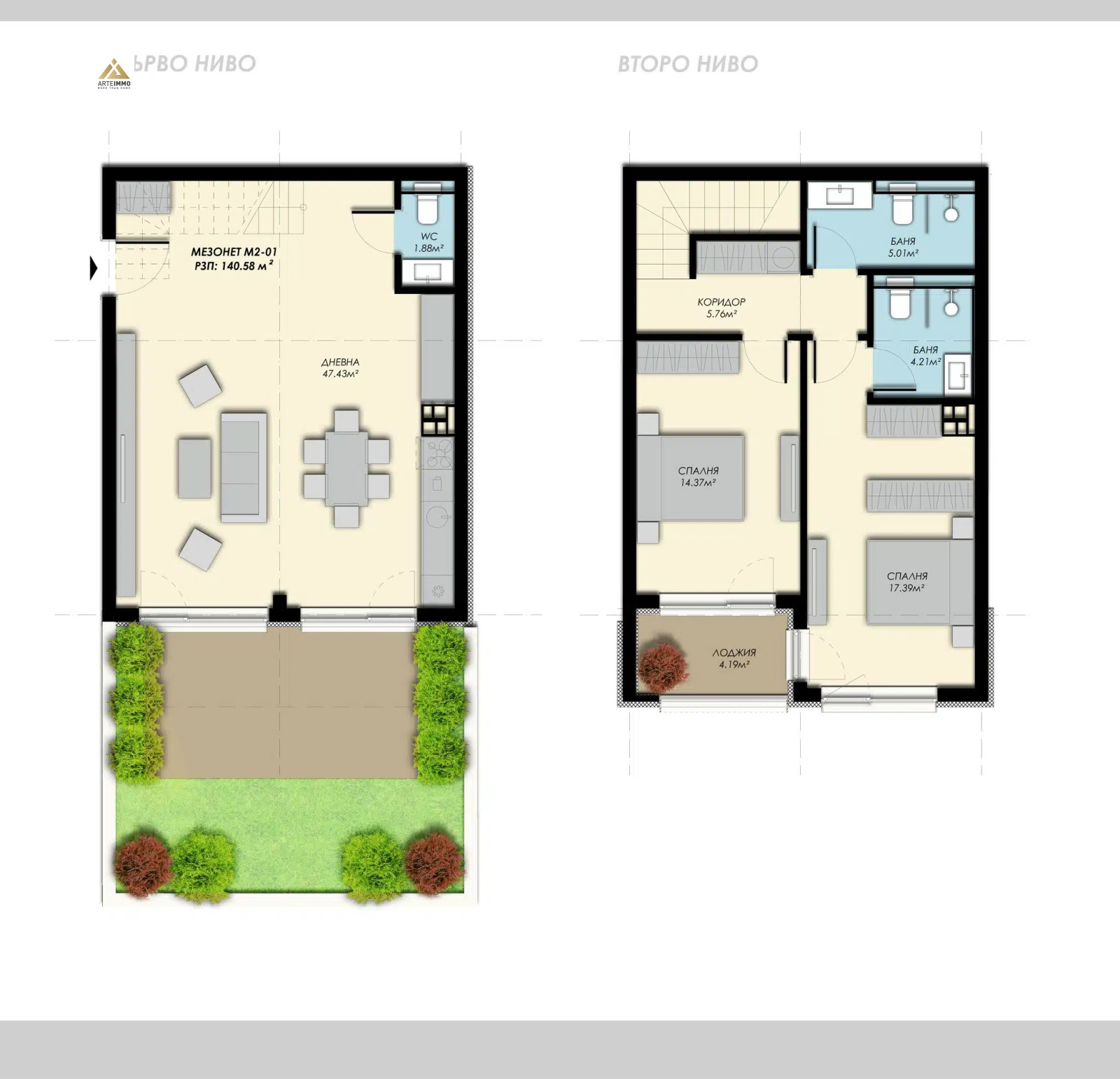 Комплексът разполага с мезонети и апартаменти с площ от 108 до 250 кв. м.