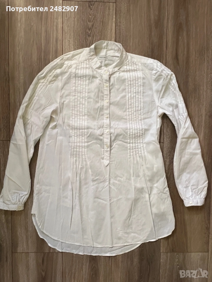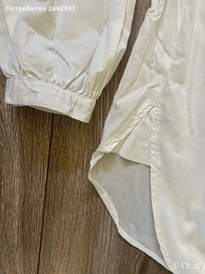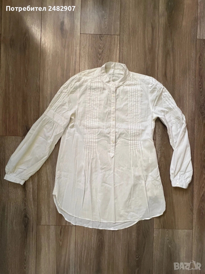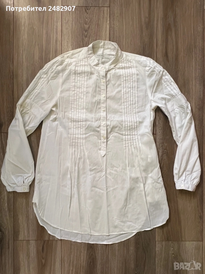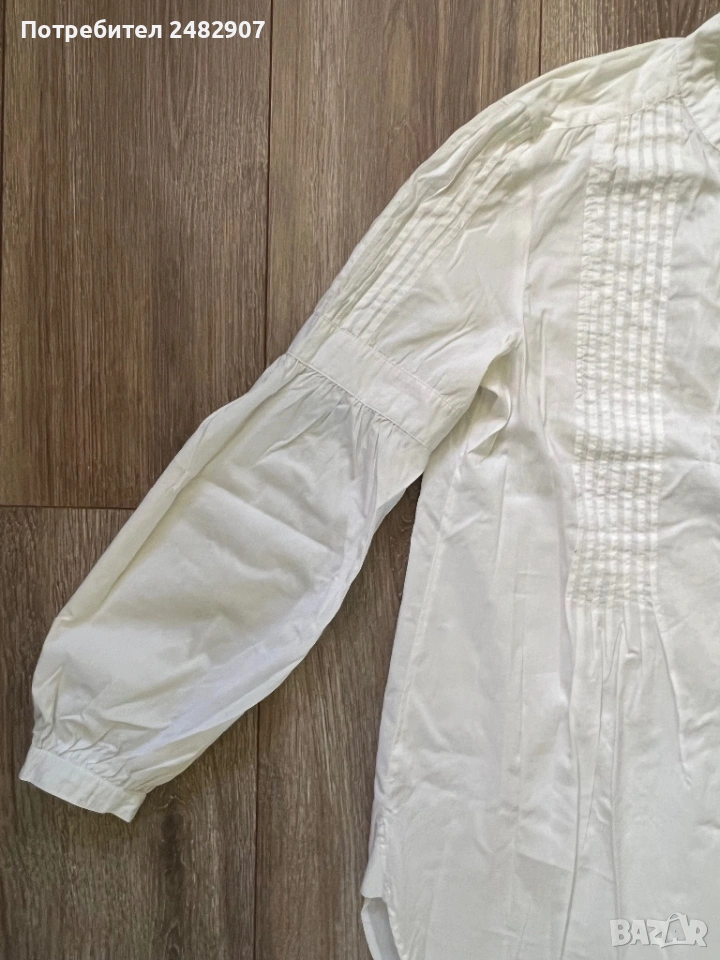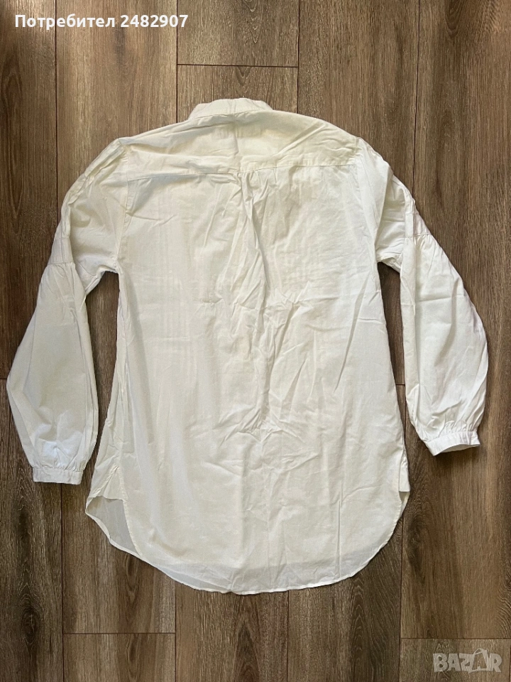 Бяла дамска дълга риза/Туника, размер М. Съдържа 68 % памук, 30 % полиамид и 2 % еластан. Ширина в раменете - 38 см, ширина под мишниците - 51 см, ширина в долната част - 60 см, дължина от рамото до долу - 77 см, дължина на ръкава от рамото - 60 см, ширина на ръкава в долната част - 9,5 см. Много запазена, почти не е използвана.
