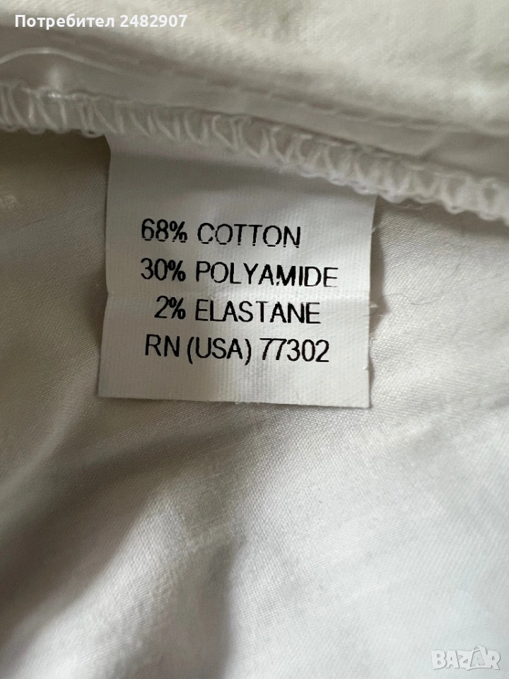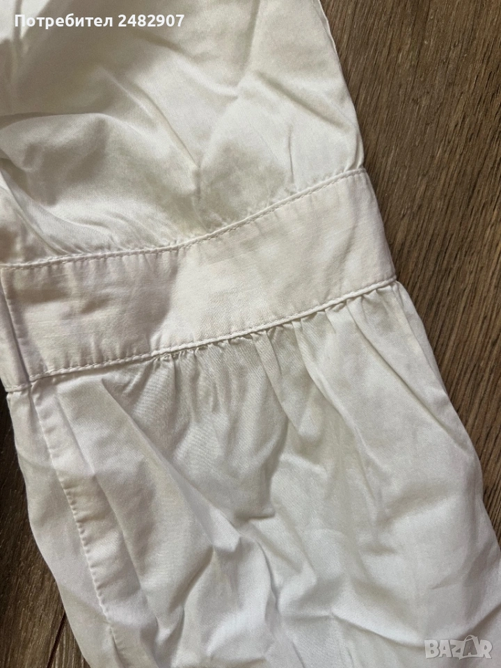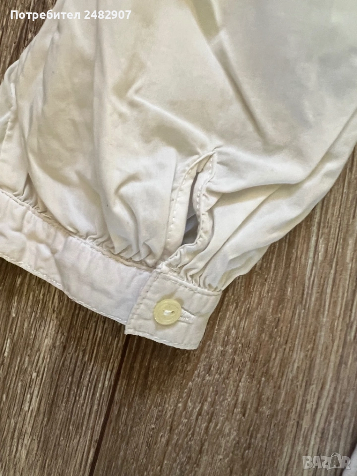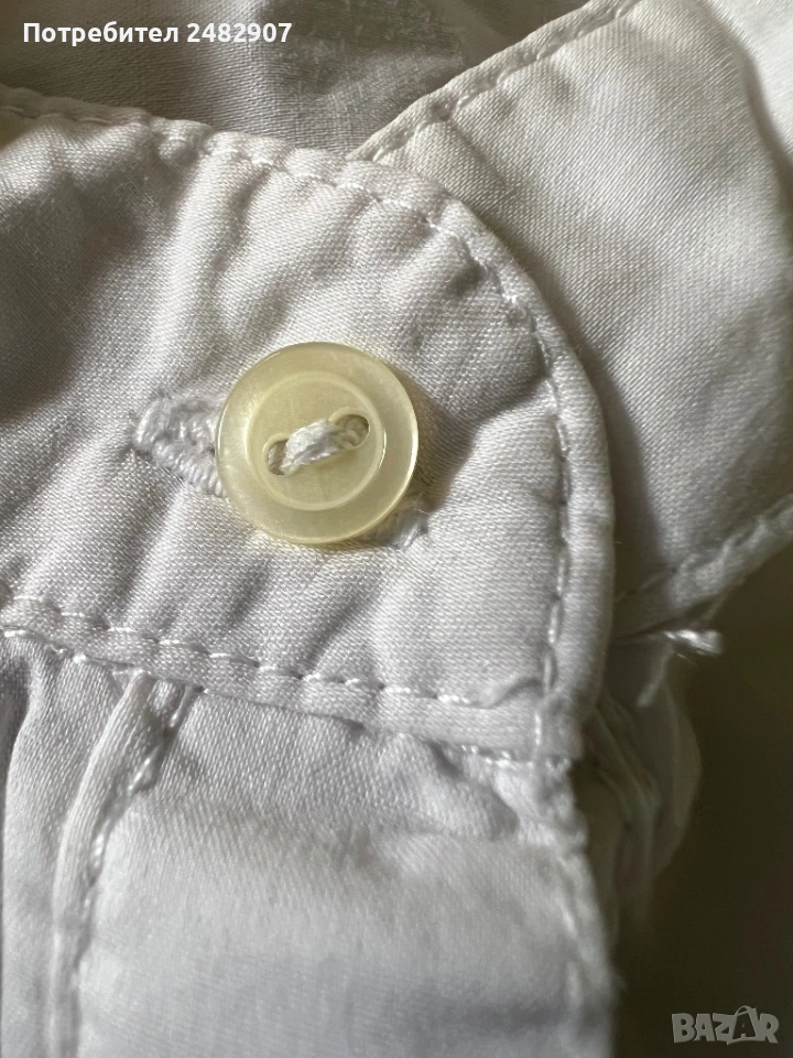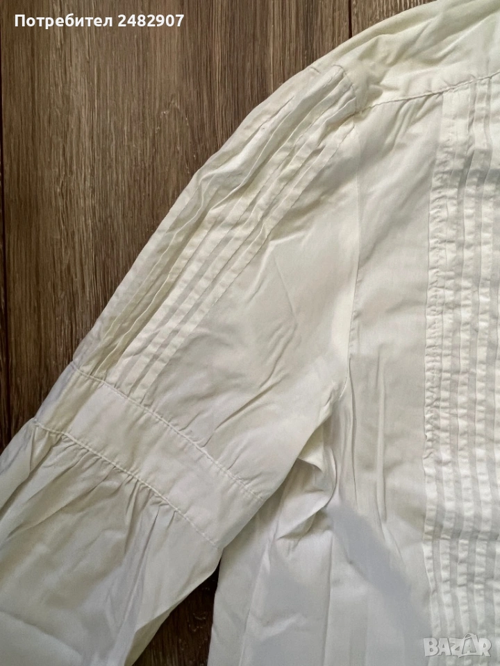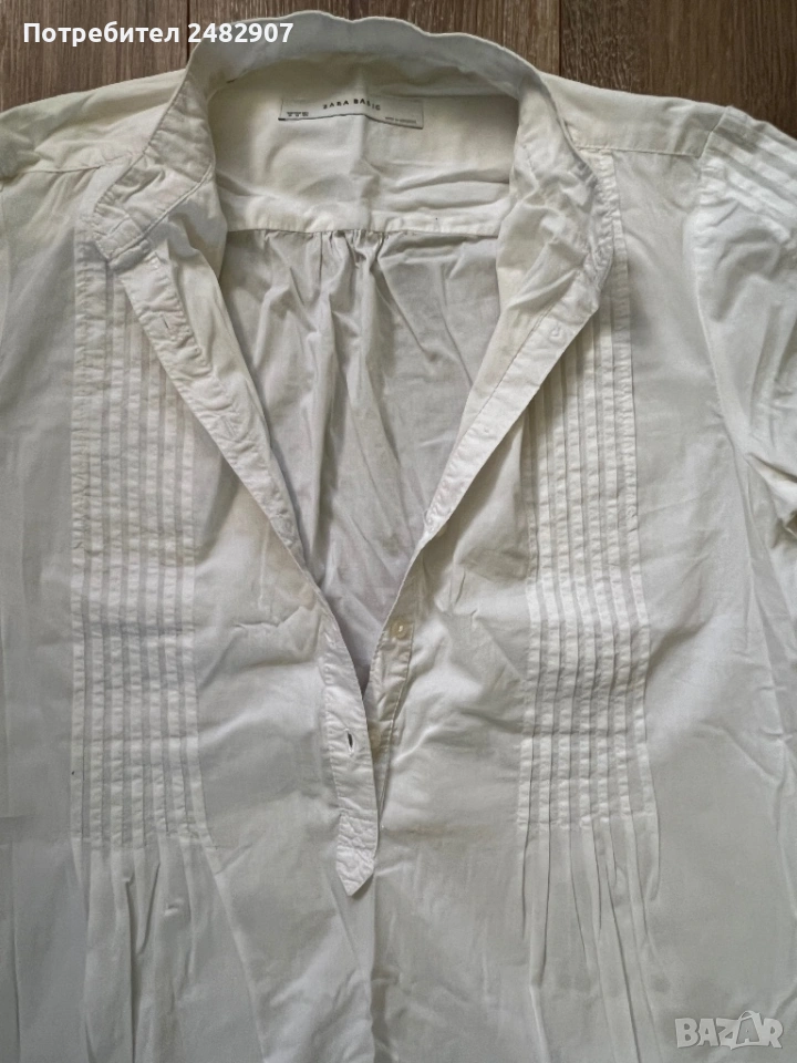 Бяла дамска дълга риза/Туника, размер М. Съдържа 68 % памук, 30 % полиамид и 2 % еластан. Ширина в раменете - 38 см, ширина под мишниците - 51 см, ширина в долната част - 60 см, дължина от рамото до долу - 77 см, дължина на ръкава от рамото - 60 см, ширина на ръкава в долната част - 9,5 см. Много запазена, почти не е използвана.
