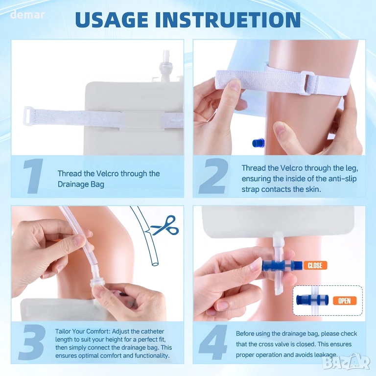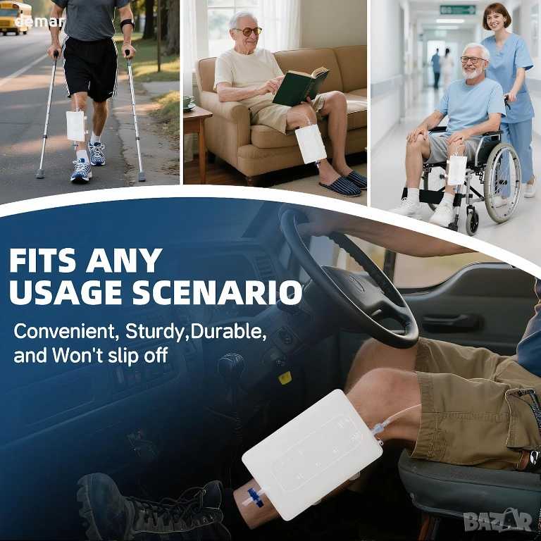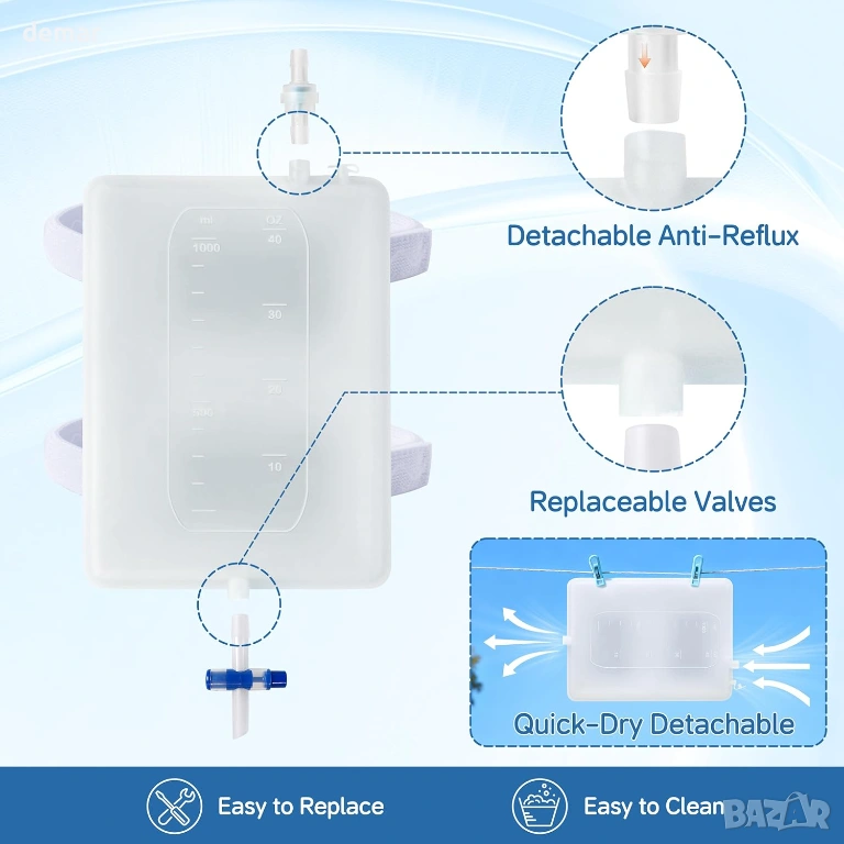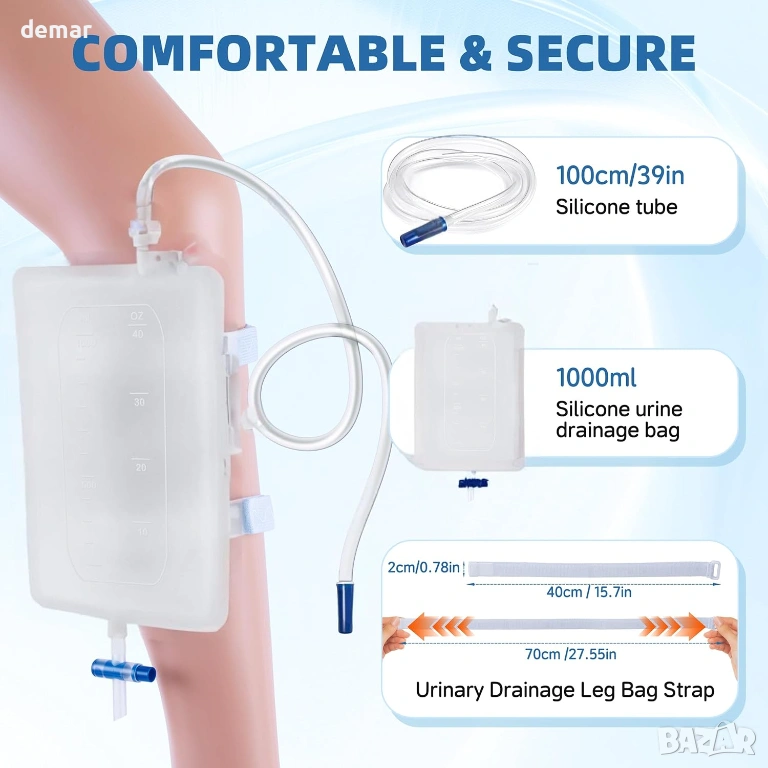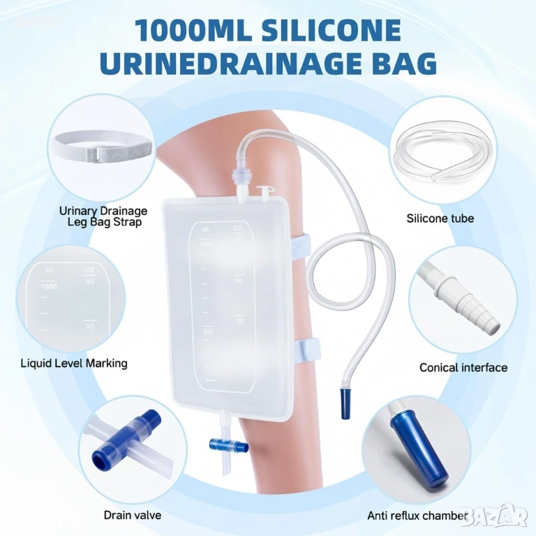 Комплект от две торбички за урина за многократна употреба с вместимост 1000 мл, изработени от висококачествен, перещ се силикон, проектирани като издръжлива и устойчива на протичане алтернатива на PVC вариантите за еднократна употреба. Всяка торбичка е с тръба с дължина 100 см за гъвкаво позициониране и е снабдена с регулируеми противоплъзгащи презрамки, за да се осигури сигурно и удобно прилягане както за мъже, така и за жени. Подходящи за следоперативно възстановяване и дългосрочни грижи, торбичките са създадени за многократна употреба, което спомага за намаляване на текущите разходи за подмяна, като същевременно предлага по-екологично решение.