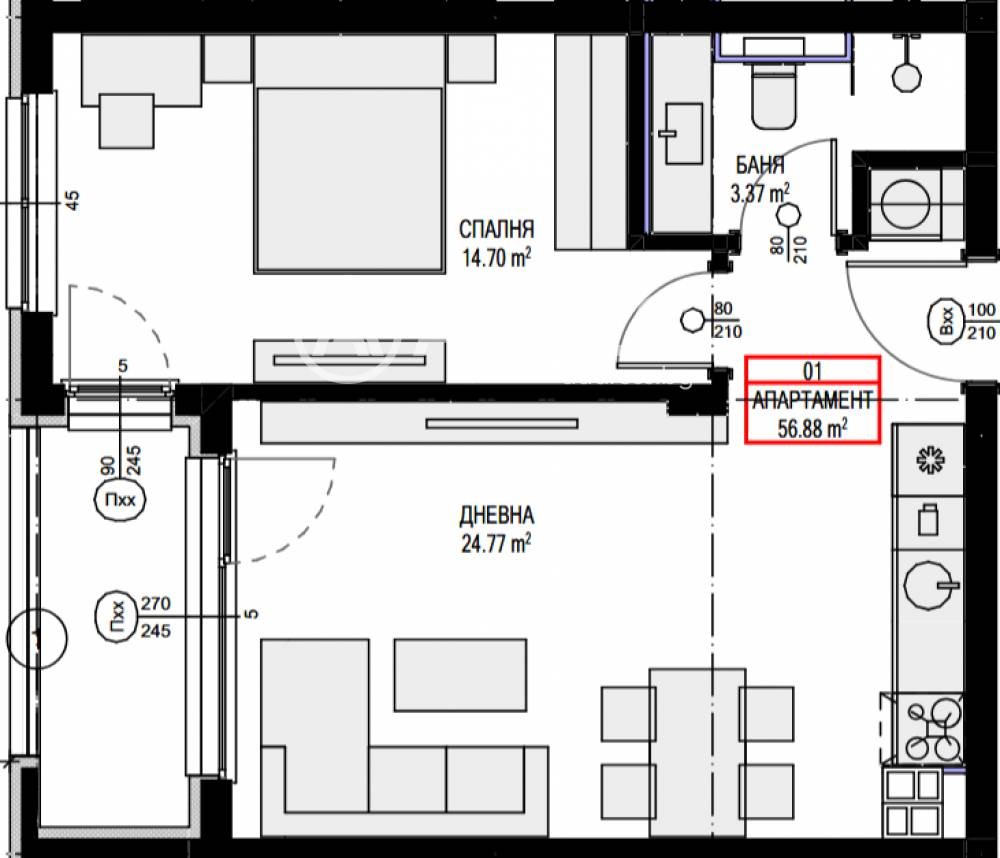 Двустаен апартамент със западно изложение, състоящ се от антре, дневна с