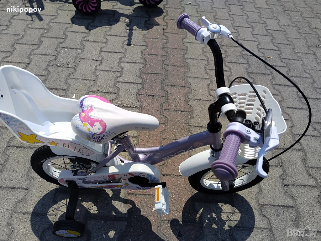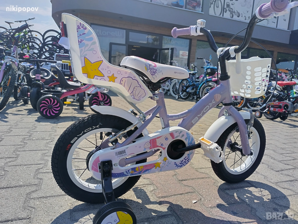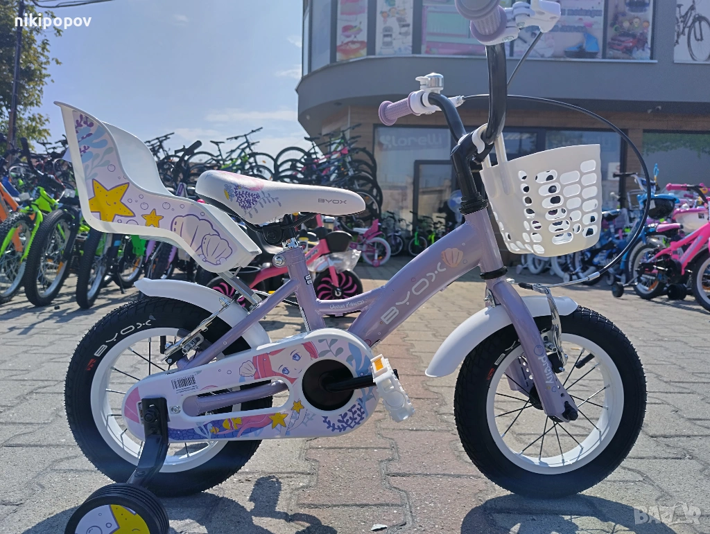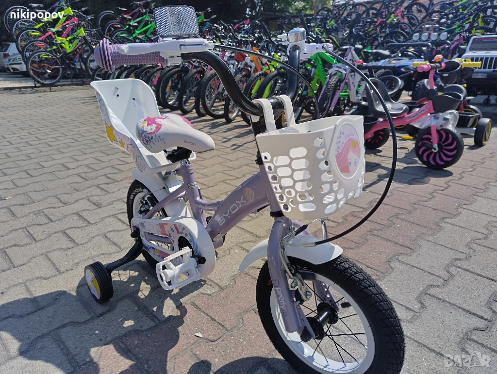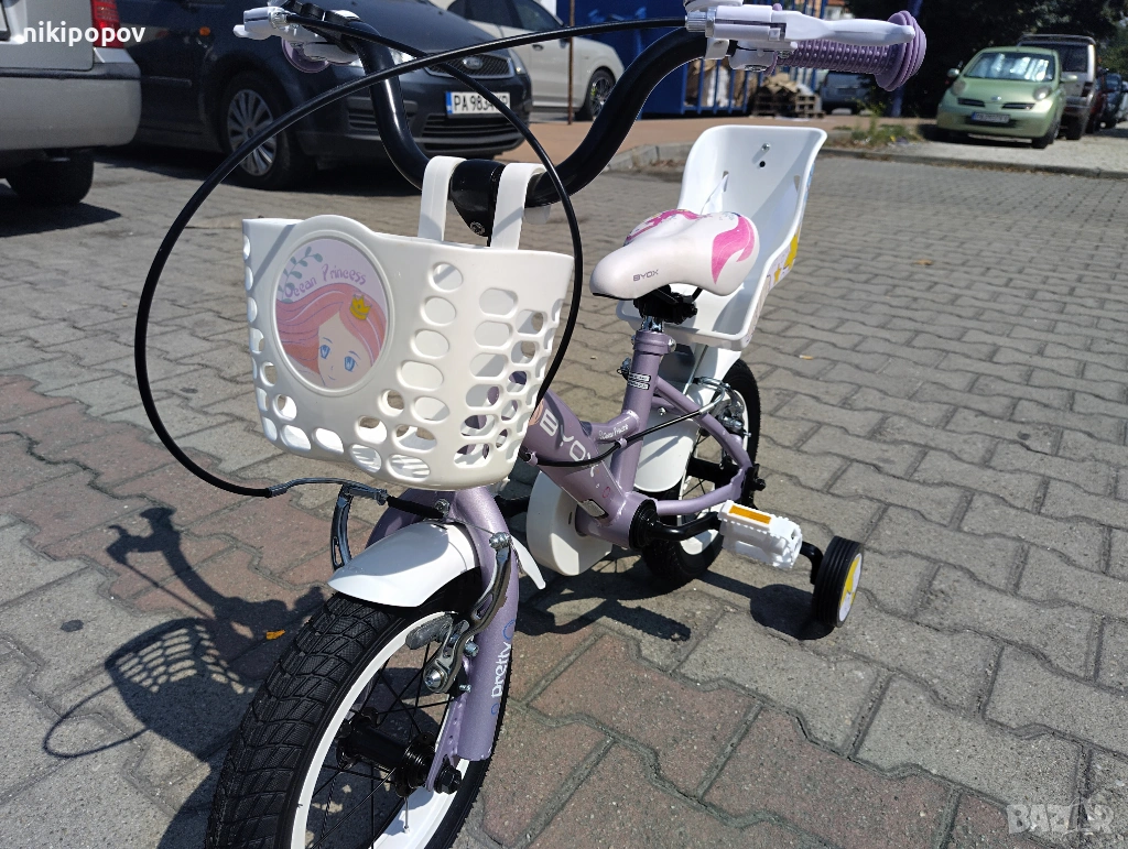*Детският велосипед Byox Princess 12″ е подходящ за деца от 2 до 4 годишна възраст и височина от 80 до 100см. Той е с метална рамка, метални калници и помощни колела. Предлага се във виолетов цвят. Спортуването под формата на игра е винаги е по-забавно. Помощните колела ще придадат сигурност на детето. Когато овладее баланса, помощните колела лесно могат да се премахнат. Педалите лесно се въртят и карането на колело ще се превърне в забавна игра в парка.