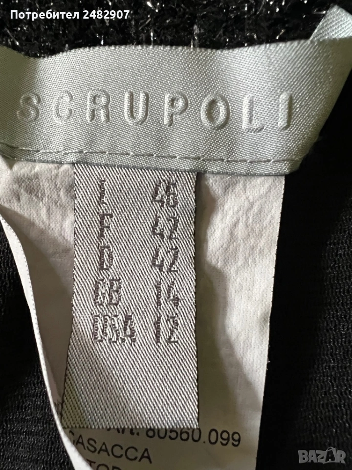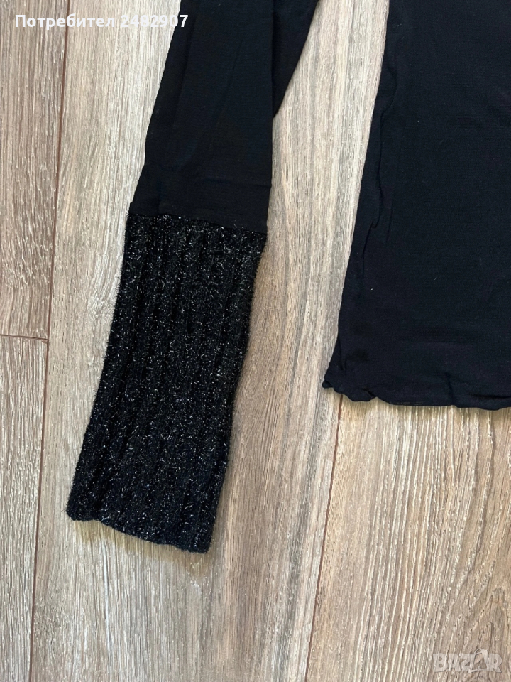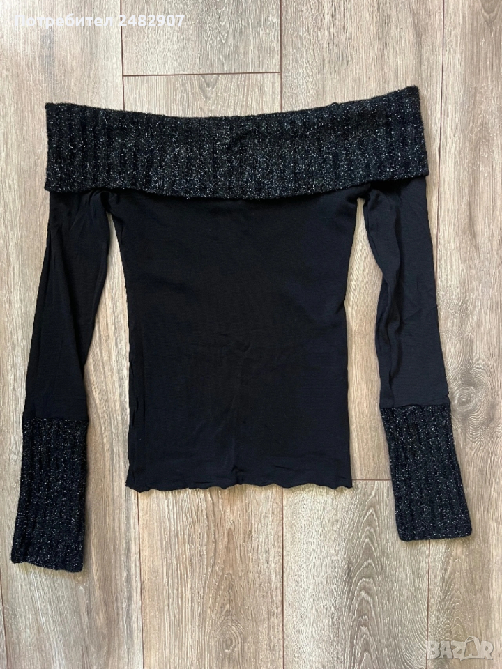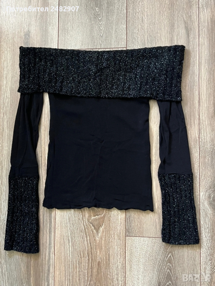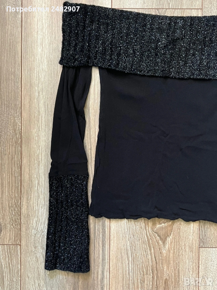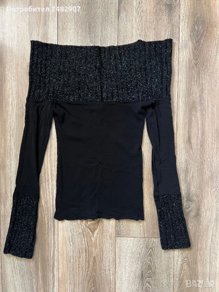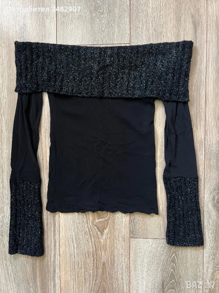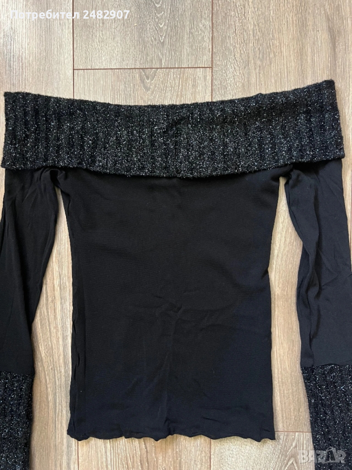 Ефектна черна дамска блуза с голи рамене и блестящ ефект, размер 42. Съдържа 60 % полиамид и 40 % вискоза. Ширина в раменете - 48 см, ширина под мишниците - 35 см, ширина в долната част - 32 см, дължина от рамото до долу - 45 см, дължина на ръкава от рамото - 57 см, ширина на ръкава в долната част - 10 см. Много запазена, обличана веднъж за повод, без забележки. Много красива, ефектна, еластична, полупрозрачна.