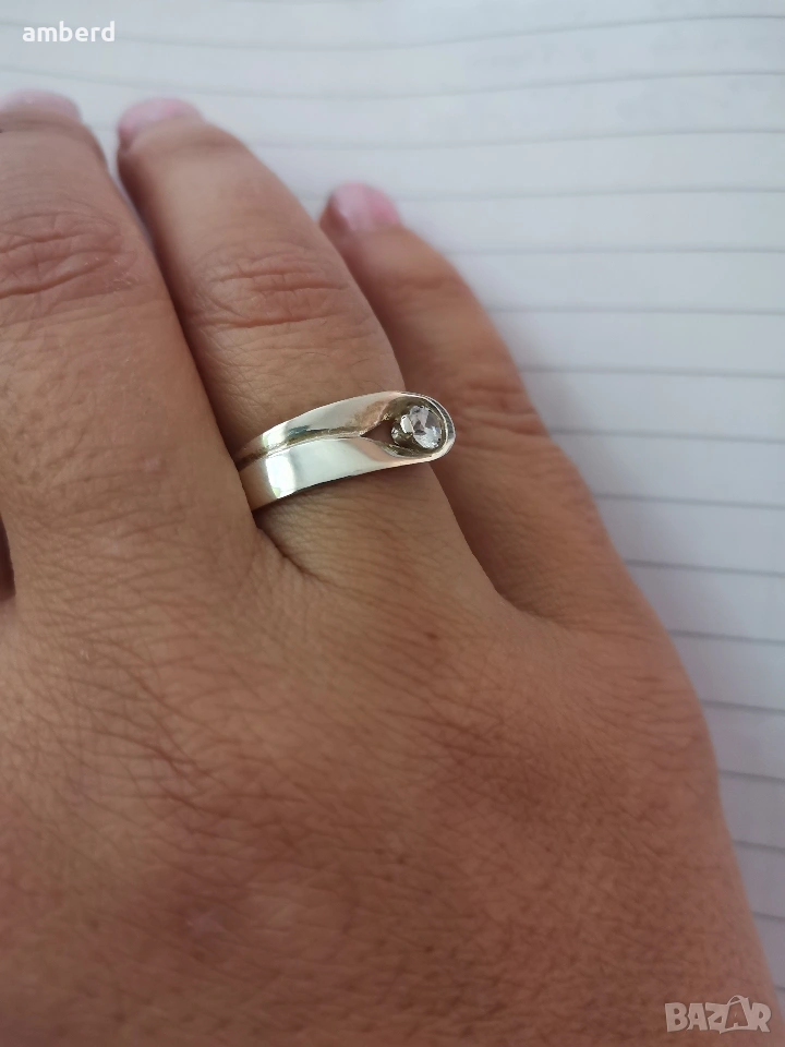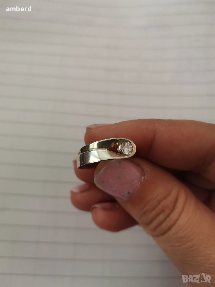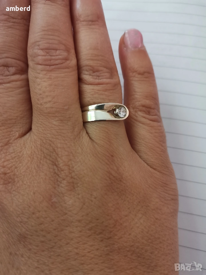 сребро проба 925 и 1 бял цирконий. Вътрешен диаметър 17мм. Можем да изработим този модел в желан от вас размер. Фирмата ни е лицензирана за производство и търговия с благородни метали и скъпоценни и полускъпоценни камъни. Всички наши бижута са ръчно изработени и маркирани в български лаборатории за контрол на качеството.