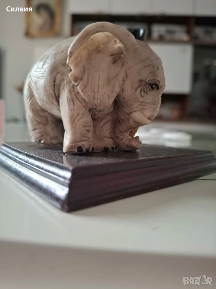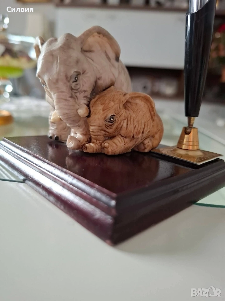 Фигури на две слончета – едното изправено, другото легнало, прегърнати в нежна поза (символ на късмет, сила и семейна връзка).