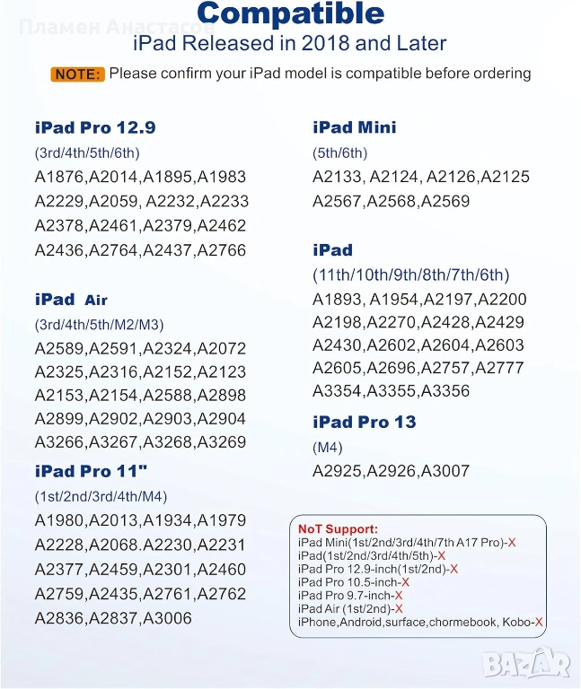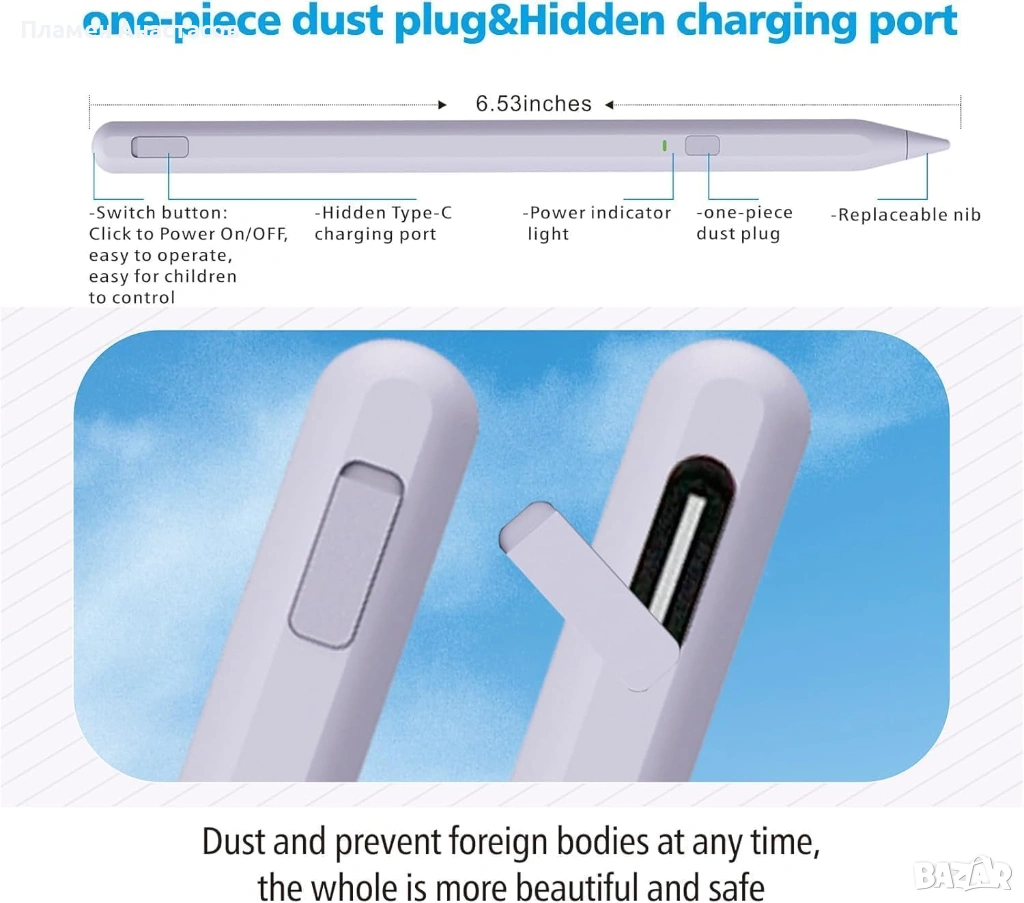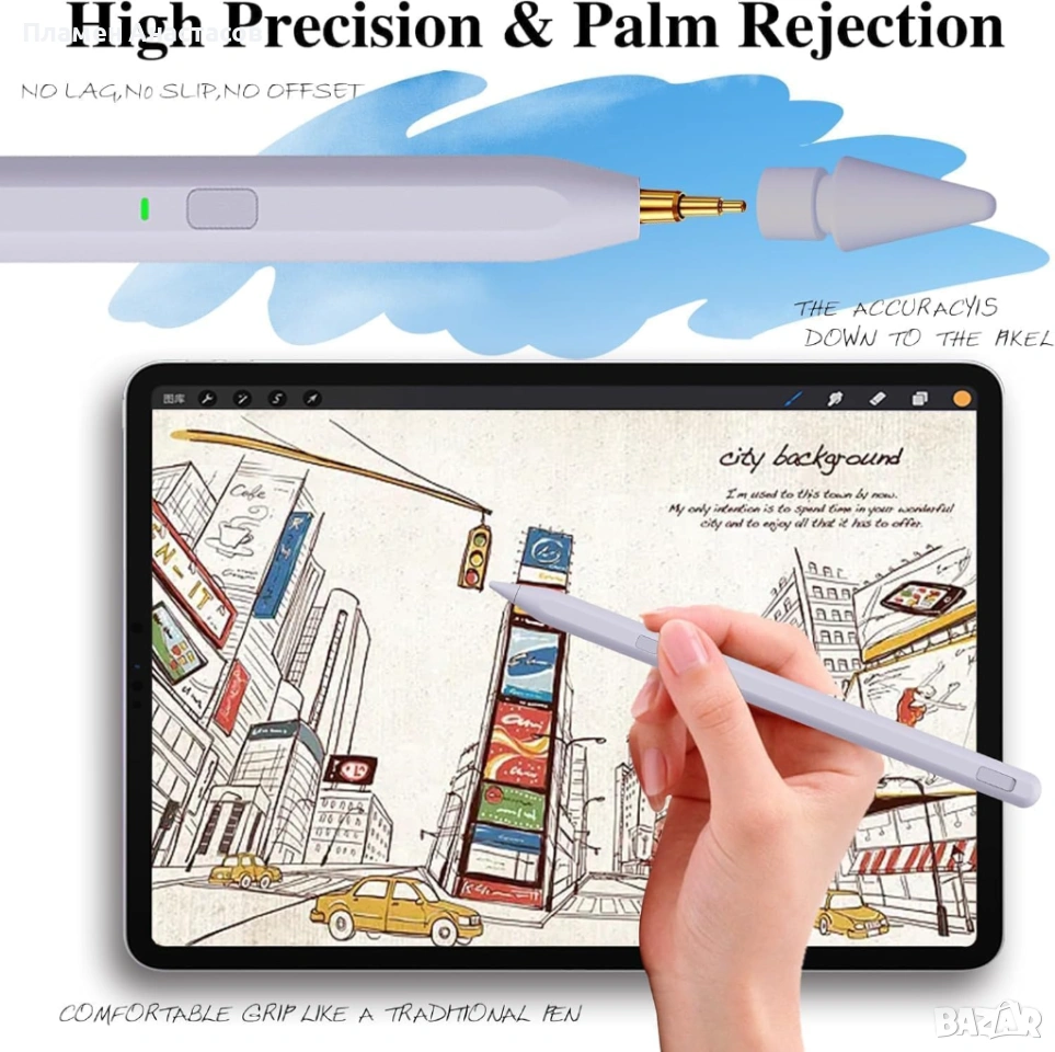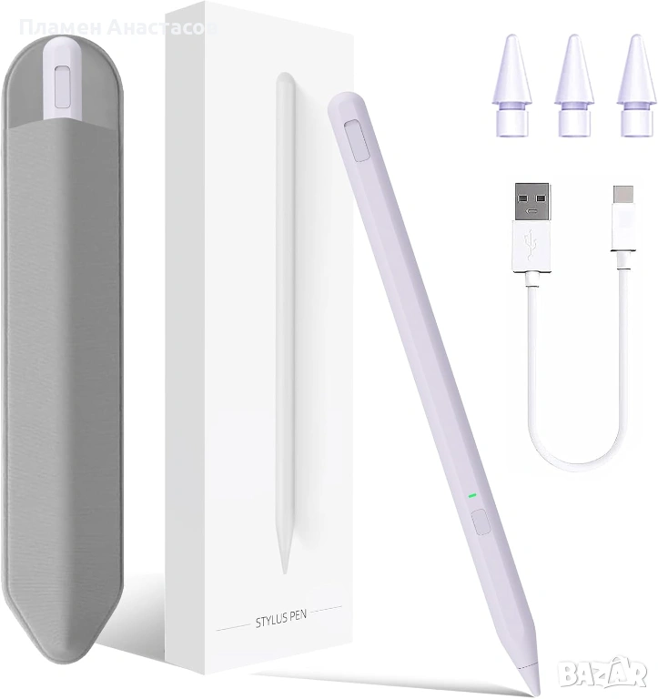 Стилусът е лек и удобен за продължителна работа, като в комплекта е включен практичен аксесоар за съхранение и лесно пренасяне. Благодарение на високата съвместимост с различни поколения iPad, той е отлично и достъпно решение като алтернатива на оригиналния Apple Pencil.