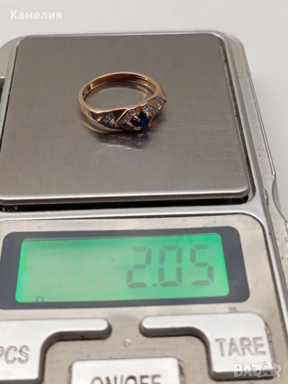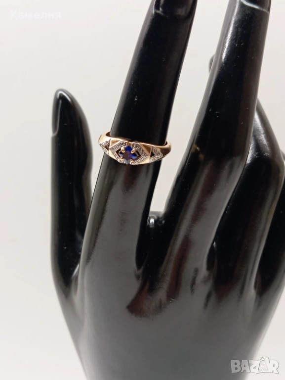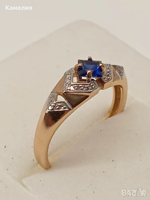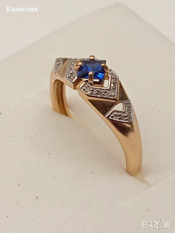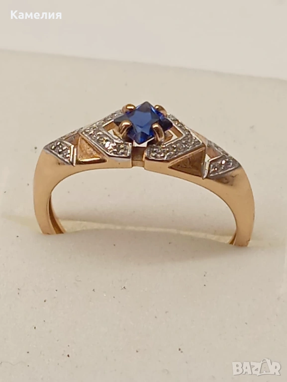 Руски златен пръстен с брилианти и лабораторен сапфир. Проба 585 глава с кокошник. Грамаж 2,05 грам. Диаметър 16 мм.