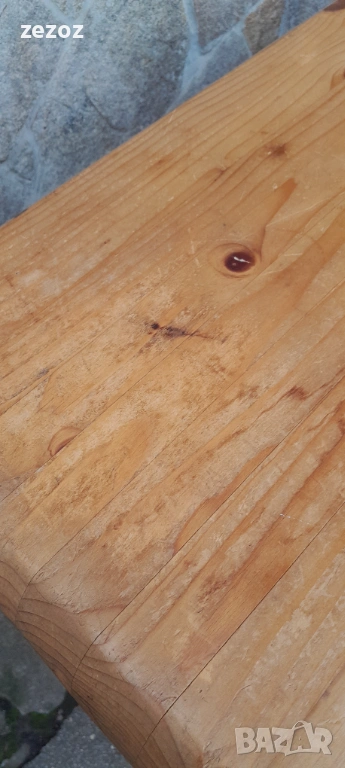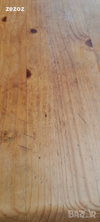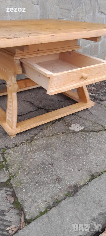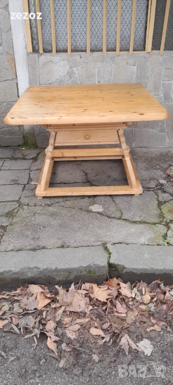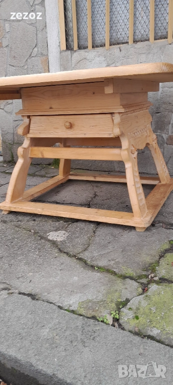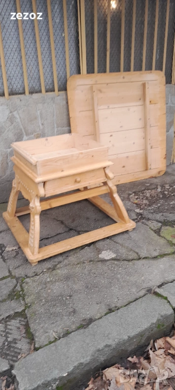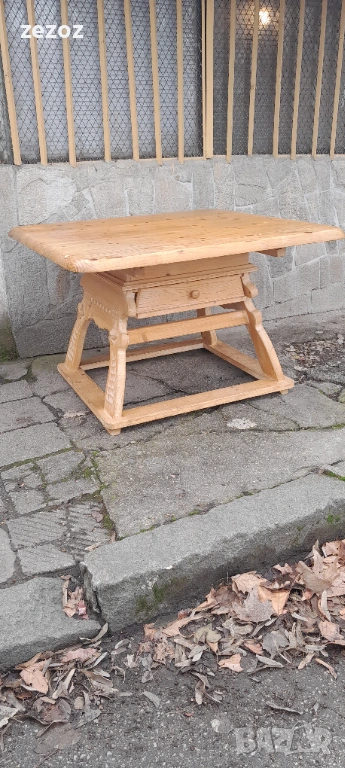 Трапезна маса изработена в Австрийски стил от иглолистна дървесина.Специфичната конструкция е характерна за алпийските селски райони.Плота е на шлици и може да се мести,като под него се открива място за съхранение.Характерно е голямото чекмедже,което може да се отваря и от двете страни.Нормални следи от употебата по плота.Размери-