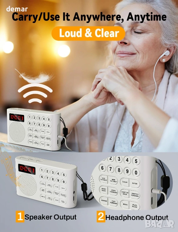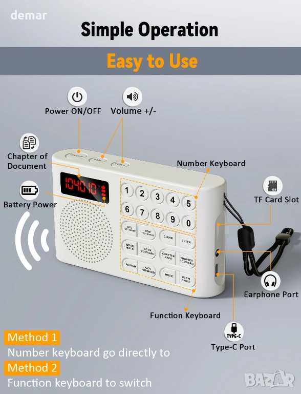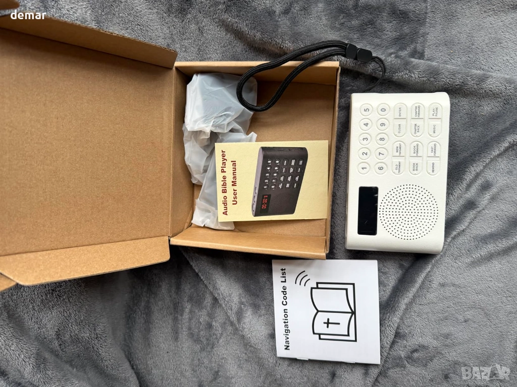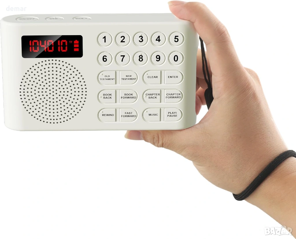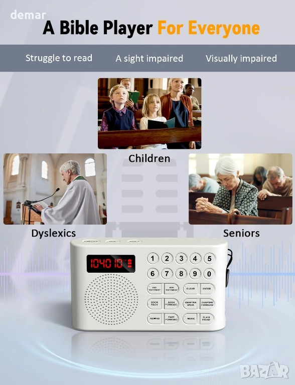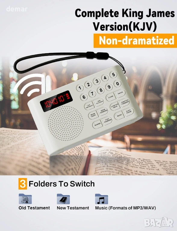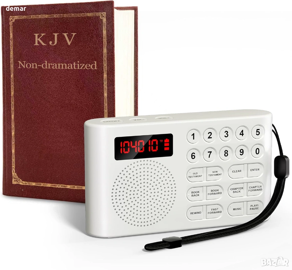 Предварително заредена с пълния аудио превод на крал Джеймс на защитена TF карта, тази електронна Библия осигурява сигурен и непрекъснат достъп, като същевременно позволява допълнителни лични аудио файлове в отделна папка. Проектирана специално за възрастни хора и потребители с увредено зрение, тя разполага с големи тактилни бутони и лесна навигация за безпроблемна работа. Устройството осигурява ясен звук, включва жак за слушалки за самостоятелно слушане и предлага до 26 часа непрекъснато възпроизвеждане с едно USB зареждане с ясен индикатор за батерията. Компактна, лека и преносима, тя е подходяща за домашна употреба, пътуване или църква, което я прави достъпно и разумно решение за възрастни хора, хора, които не четат, хора с дислексия и всеки, който търси удобен достъп до аудио стихове от Писанието.