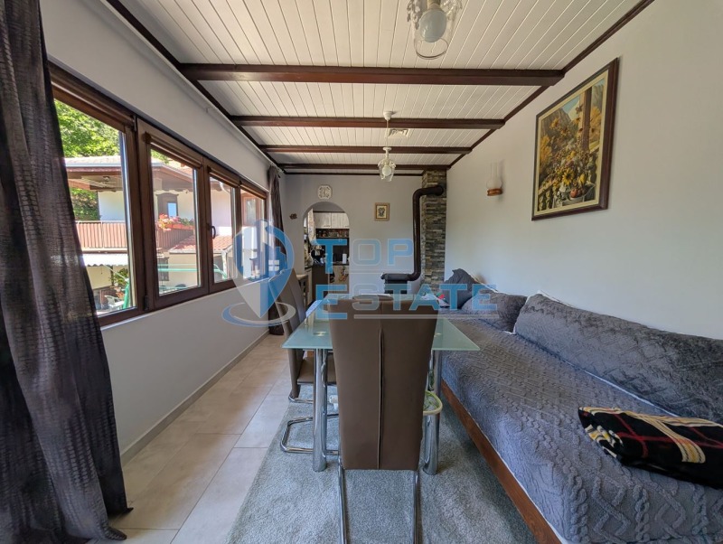 Топ Естейт Недвижими имоти има удоволствието да Ви предложи реновирана двуетажна къща в Тревненския балкан. Предлаганият имот се намира в малко селце, разположено на 3 км от град Трявна, с достъп по асфалтов път. Къщата е с РЗП от 157 кв. м и се състои от всекидневна, кухня, две спални и баня с тоалетна. На втория етаж се помещават хол, кухня, две спални, мокро помещение с дрешник, баня и тоалетна, тераса с панорамна гледка. Къщата е изцяло реновирана, като част от подобренията включва: нови ВиК и ел. инсталации, PVC дограма - златен дъб, подови настилки - ламиниран паркет, теракот и гранитогрес, нов покрив и улуци, отоплението е централно чрез термопомпа, като има и поставени климатици и камина на твърдо гориво. Къщата е изцяло обзаведена и оборудвана и се продава в този вид. Допълнително къщата има избено помещение (работилница), складово помещение, ходрофорна система - собствен водоизточник. Лятната кухня е с площ 36 кв. м и се състои от обзаведена стая - трапезария и оборудвана кухня. Допълнително до лятната кухня има складово помещение, което може да се обособи за жилищни нужди, както и навес, изградена е и нова външна тоалетна. Дворното място е с площ 846 кв. м, като е оградено с каменен зид и ограда, в него има допълнителна постройка за жилищни или стопански нужди. Разполага с голяма портална врата за паркиране на автомобил, както и място за паркиране пред къщата. От къщата се открива красива панорамна гледка към централна Стара планина. Имотът е изключително подходящ за постоянно живеене на тихо и спокойно място, далеч от забързаното градско ежедневие, така и за ваканционен имот, или да бъде използван и за бизнес цели - отдаване под наем, като къща за гости. Номер на оферта: 3277. We speak English and German.