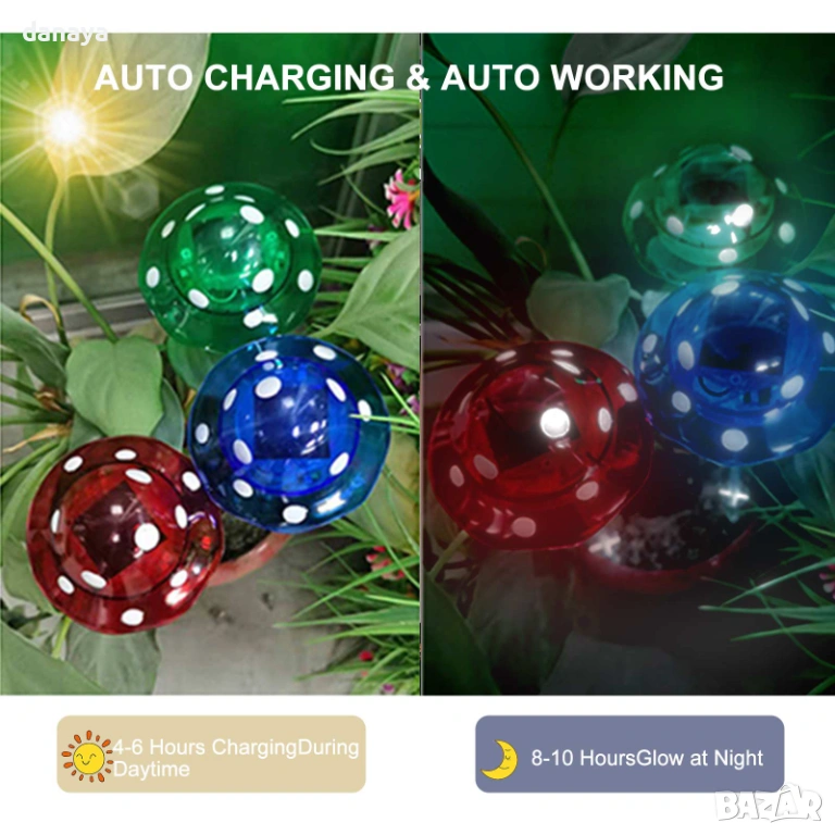 Всяка соларна лампа гъба се зарежда през деня от слънчевата светлина и се включва автоматично при здрач. Благодарение на соларното захранване, тези соларни лампи гъби не изискват кабели, ток или допълнителни разходи за електроенергия. Лампите се продават по брой, което позволява да изберете точното количество според пространството и желания ефект.