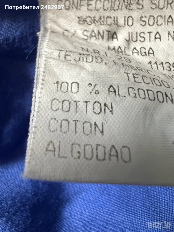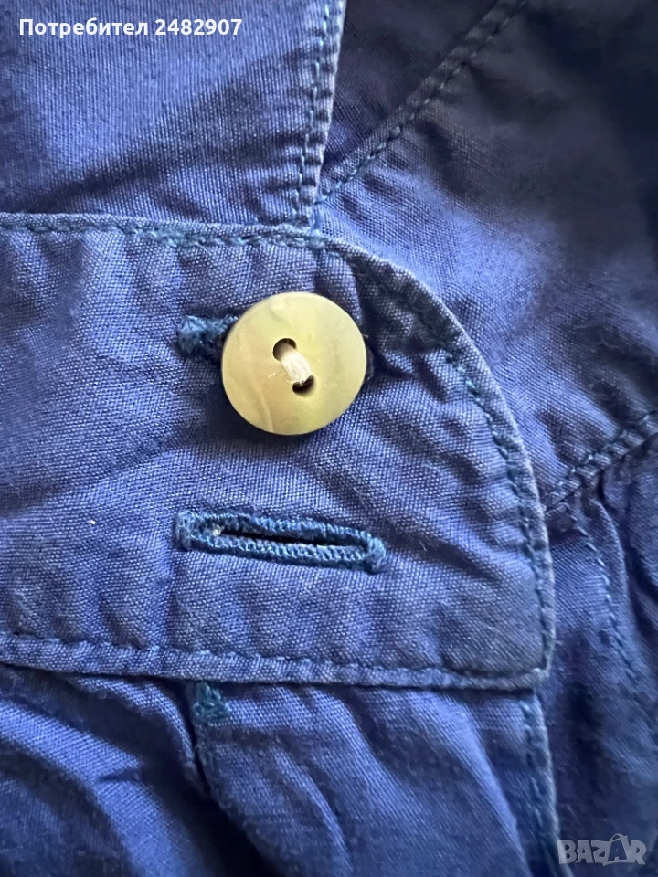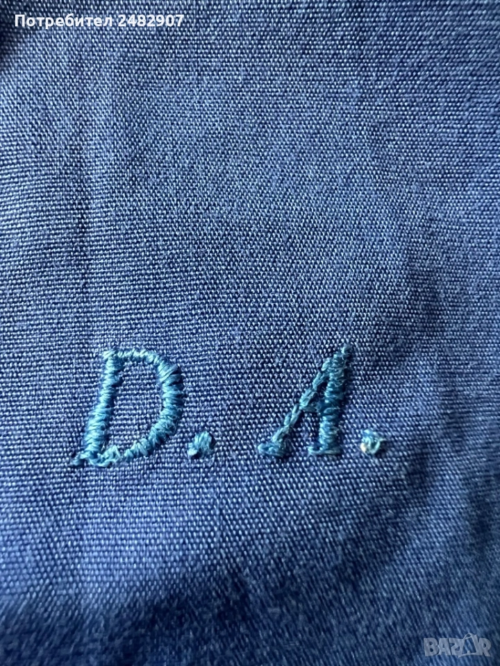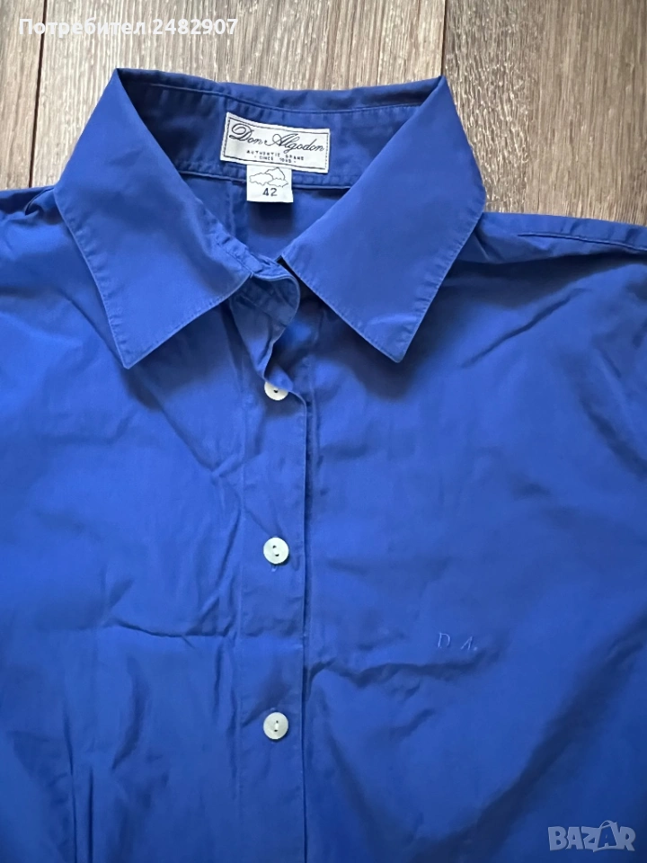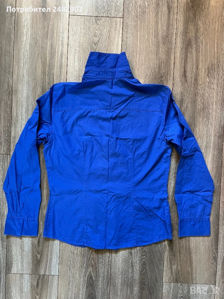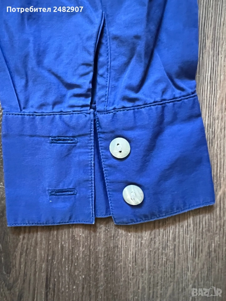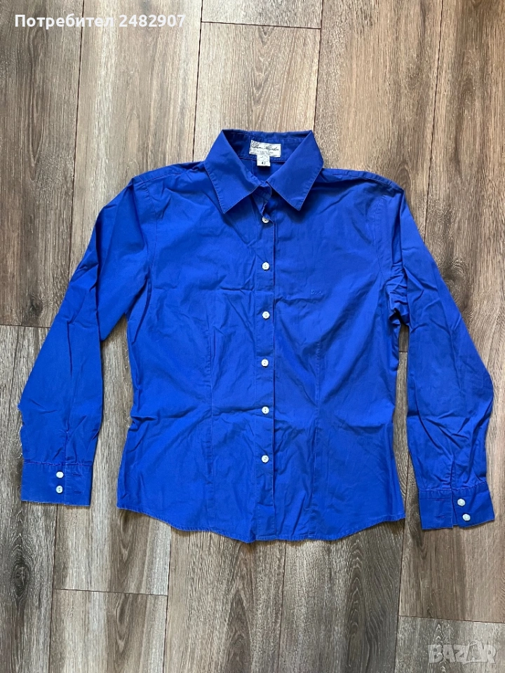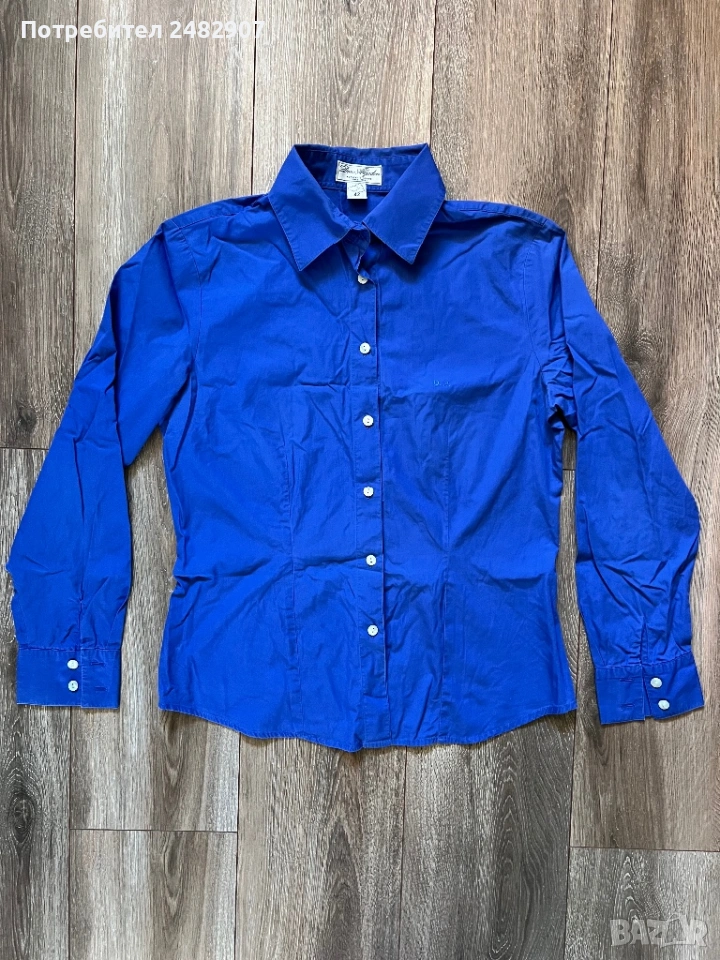 Тъмно синя висококачествена дамска риза, размер 42. Съдържа 100 % памук. Ширина в раменете - 41 см, ширина под мишниците - 50 см, ширина в долната част - 50 см, дължина от рамото до долу - 64 см, дължина на ръкава от рамото - 58,5 см, ширина на ръкава в долната част - 10 см. Много запазена, почти не е използвана, без забележки, с изключение на едно липсващо копче на деколтето.