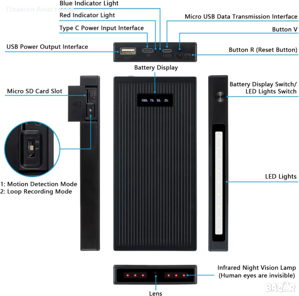 Скрита камера Powerbank 10000 mAh е компактно и дискретно устройство за видеонаблюдение, което изглежда като обикновена външна батерия. Съчетава реален powerbank и Full HD камера в едно тяло, което я прави подходяща за дома, офиса, пътуване или автомобил.