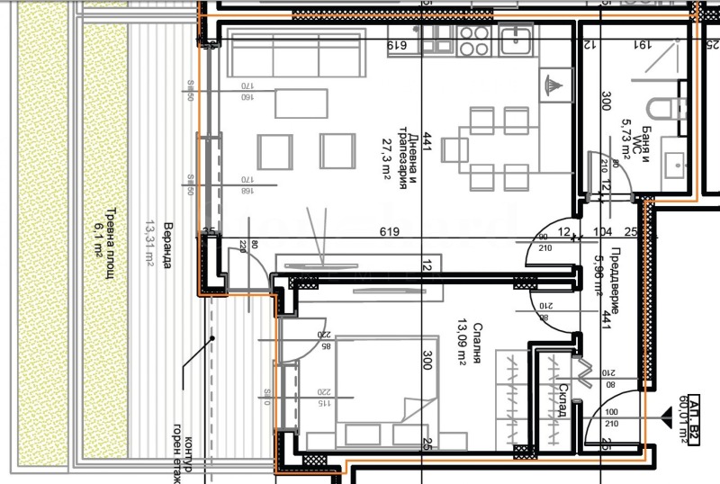 Жилището с обща площ от 7258 кв.м е разположено на 1-ви етаж от 5 и разполага с веранда - 13,31 кв.м и тревна площ - 6,10 кв.м.
