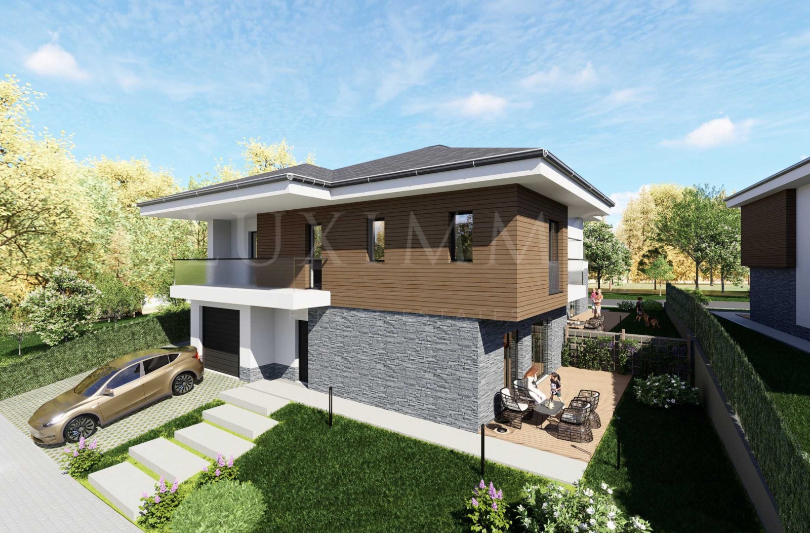 Всеки дом е развит на три нива, включва английски двор, собствен гараж и просторна дневна зона, ориентирана към южната градина. Архитектурата следва съвременна естетика с ясни линии и премерен ...